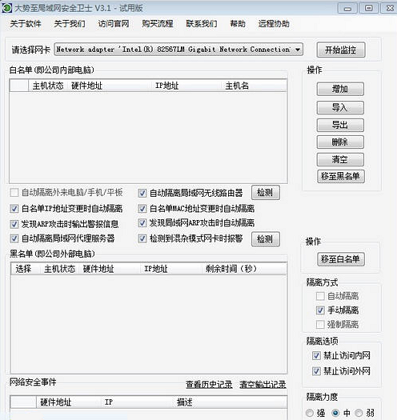 大势至内网安全卫士是大势至(北京)软件工程有限公司推出的一款专业的局域网安全防护系统,以有效防止外来电脑接入公司局域网、有效隔离局域网电脑,有需要的赶紧来下载使用吧。(禁止电脑上网或禁止电脑访问局域网服务器共享文件,或者禁止电脑与局域网其他电脑通讯;同时也可以禁止员工自带笔记本电脑、iPad、智能手机等通过有线或无线wifi的方式接入公司局域网)、禁止电脑修改IP和MAC地址、检测局域网混杂模式网卡、防御局域网ARP攻击、检测局域网代理软件、禁止电脑代理上网等为核心功能,可以为企事业单位局域网网络安全、规范网络管理和商业机密保护提供有效的解决方案。