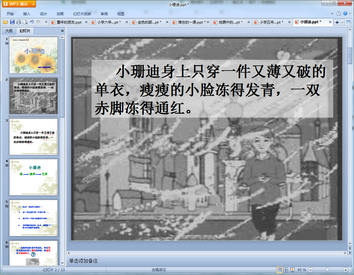 小珊迪身上只穿一件又薄又破的单衣,瘦瘦的小脸冻得发青,一双赤脚冻得通红。