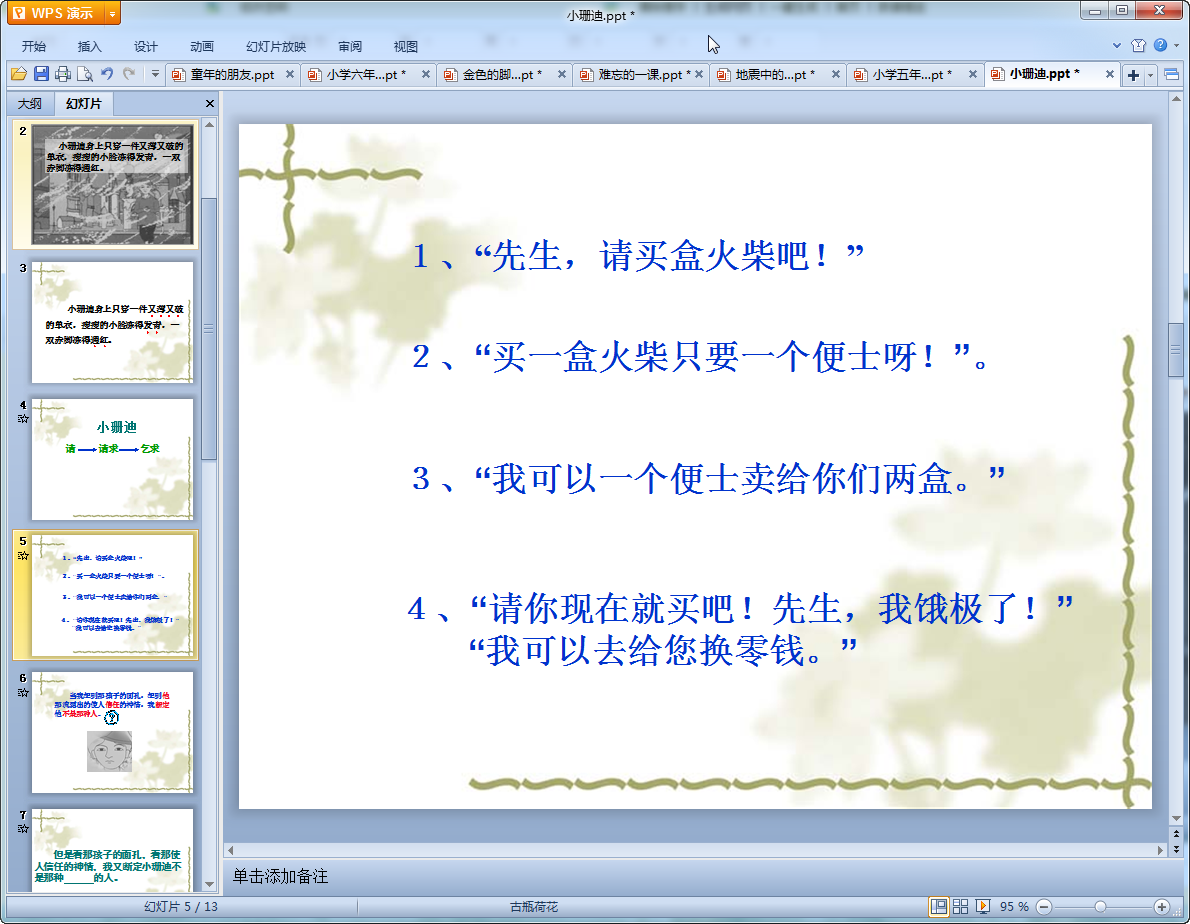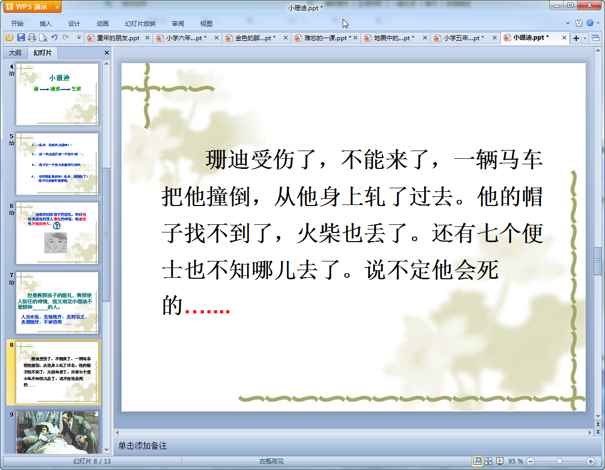 这里给大家带来的是一篇小学语文中的小珊迪教学课件,课文讲述了一个小男孩在找零钱的路上除了车祸后来拜托别人将零钱还回去的故事,一个令人落泪的故事,十分具有教育意义的一篇课文,有需要这篇文章ppt课件的朋友们可以来我们这边免费的下载!