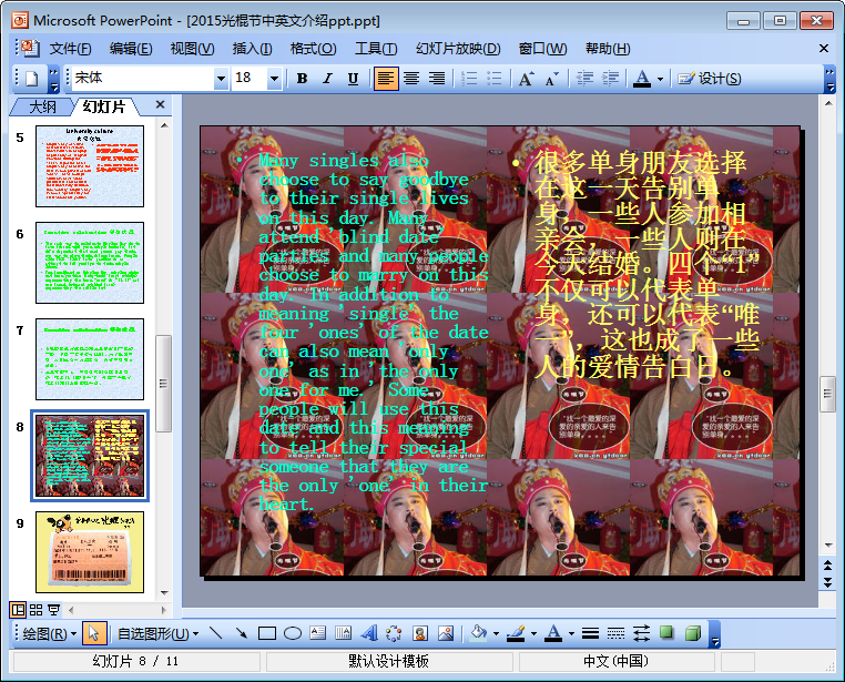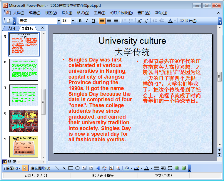 2015年的光棍节就要来了,如果你还没有脱单或是还没有准备好脱单的话,那么亲爱的朋友祝你光棍节快乐哦!好了,言归正传,为大家介绍一下这份ppt——该ppt共11页,全名为2015光棍节中英文介绍ppt,通俗一点来书是一份关于光棍节的ppt,希望对大家有所帮助!