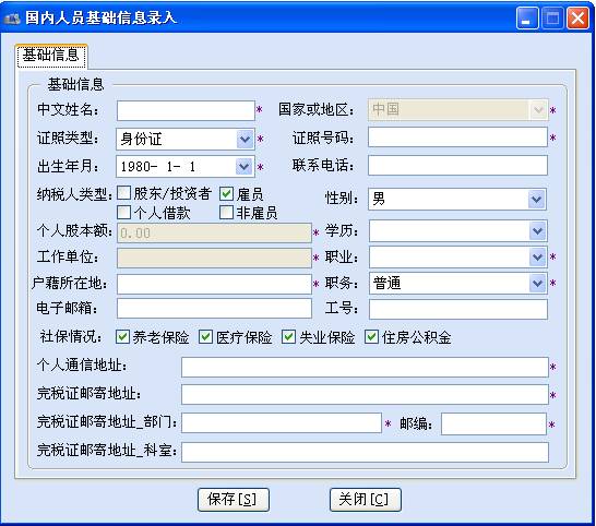 在录入界面逐一进行填写(带*号的项为必填项;完税证邮寄地址要认真填写,该项是税务机关为纳税人邮寄完税凭证的地址),填写完点击【保存】按钮即可成功保存一条员工信息,以此方法将员工基础信息全部录入完毕即可。