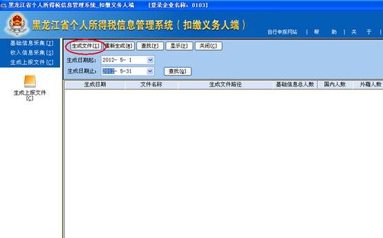 点击系统左侧【生成上报文件】下的【生成上报文件】按钮,进入到生成上报文件界面,生成日期一般不需要修改,然后点击【生成文件】按钮