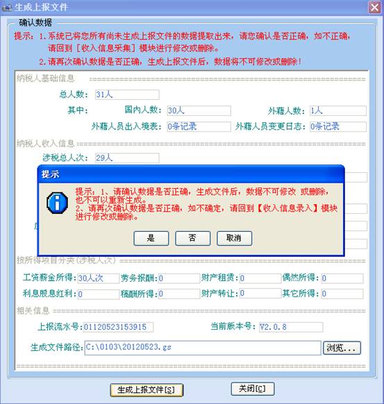 进入到生成上报文件数据确认界面,确认信息无误后再点击【生成上报文件】按钮(一但生成了上报文件,生成的数据是不可以进行修改和删除的操作的),确定后系统提示“生成成功!”