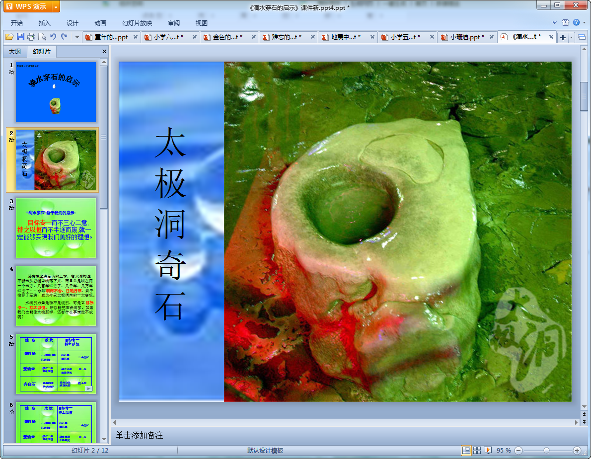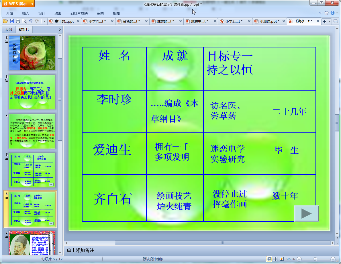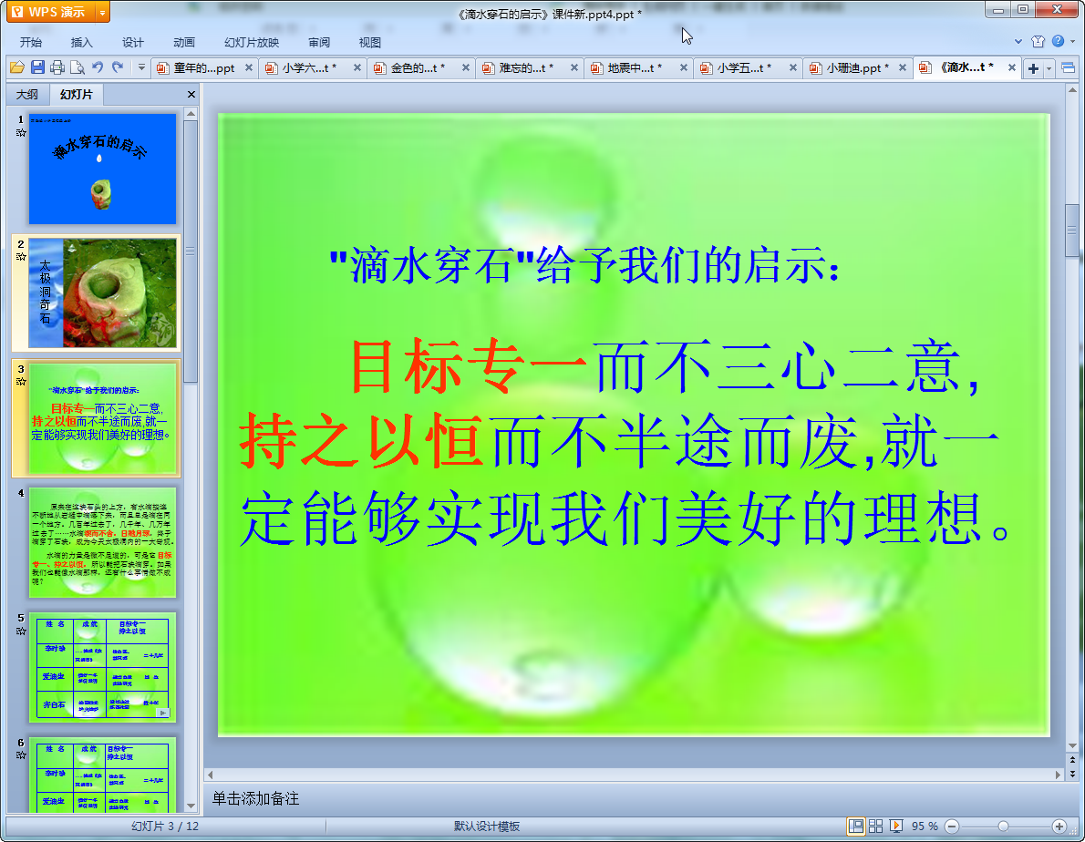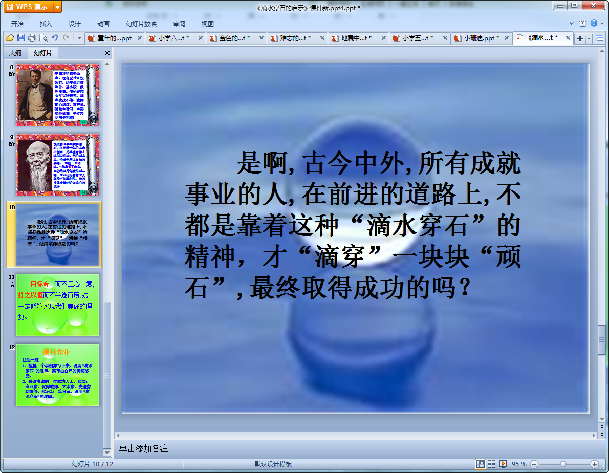 这里给大家带来的是小学语文课文中的滴水穿石的启示教学课件,讲述了持之于恒的道理,对学生们有很大的教育意义,课件共有12页有兴趣的老师们可以来这边免费的下载使用!