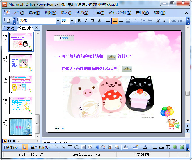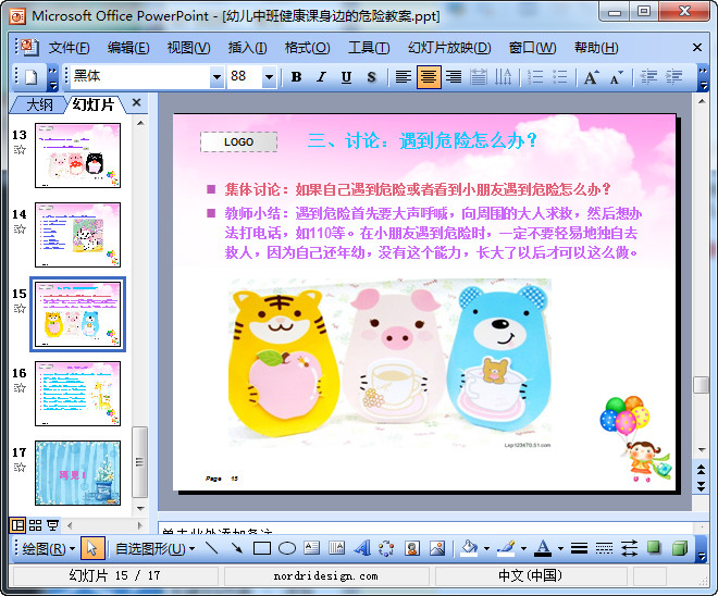 幼儿中班健康课身边的危险ppt课件,总共有17页,非常的精美,很适合幼儿园的小朋友们来观看,让孩子们能够提高危险意识,学会自我保护,能够更加健康地成长哦。欢迎前来东坡下载使用。