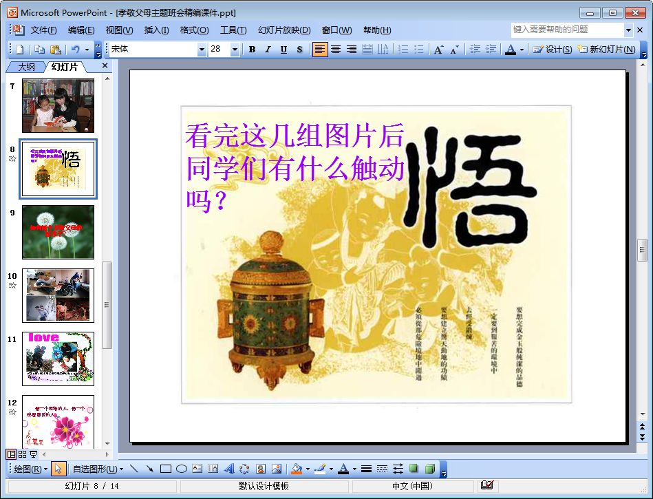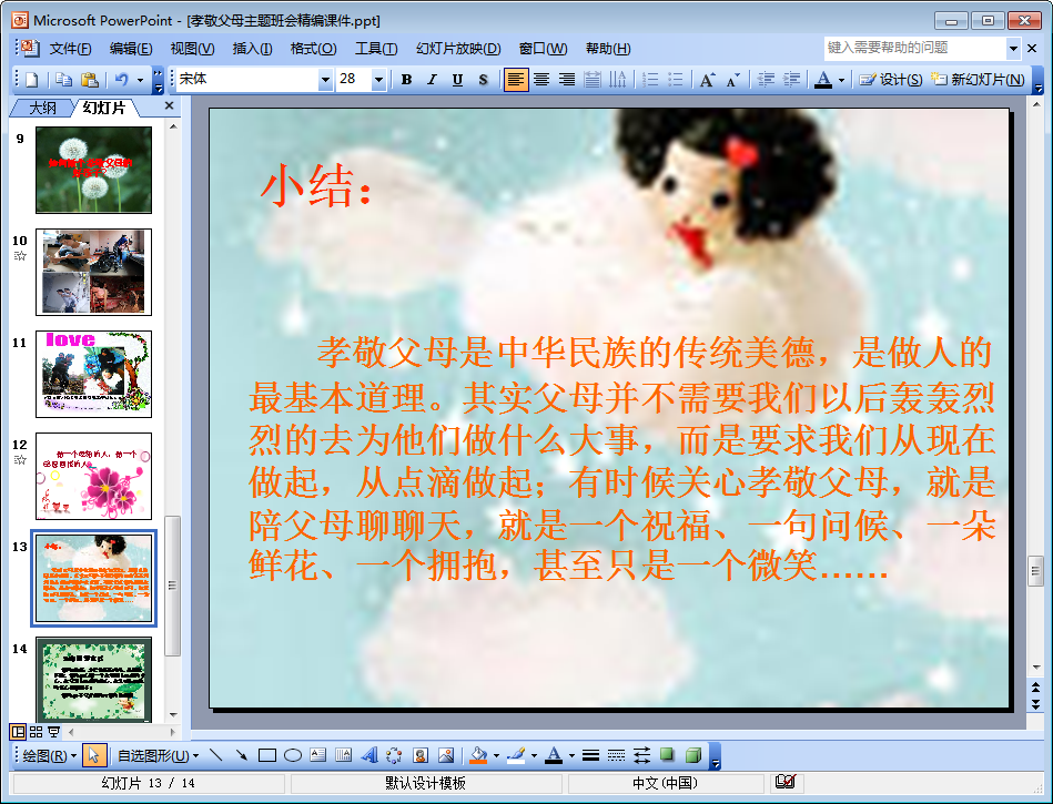 这是一份内容易于小学阶段的学生理解的ppt课件——共由14页组成的小学孝敬父母主题班会精编课件(以下简称为孝敬父母主题班会ppt),ppt以图片为主,并配以简单的文字说明,是一份颇具引导性和教育性的ppt课件,欢迎有需要的朋友们前来下载查阅!