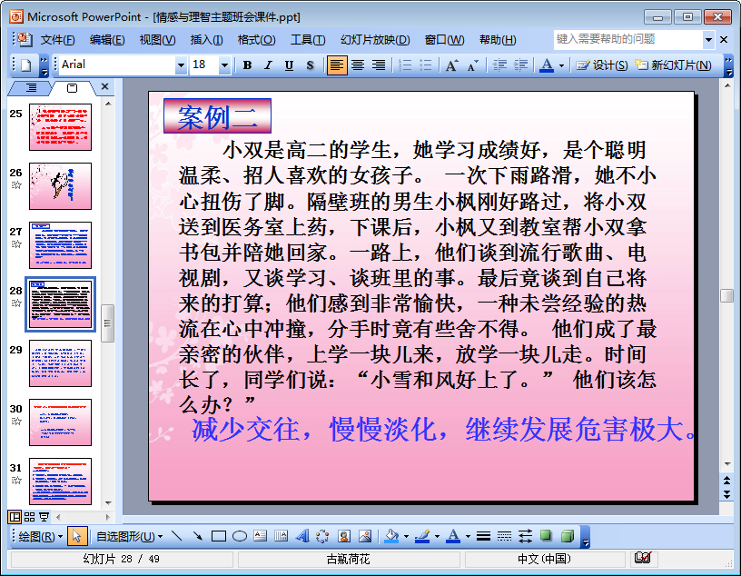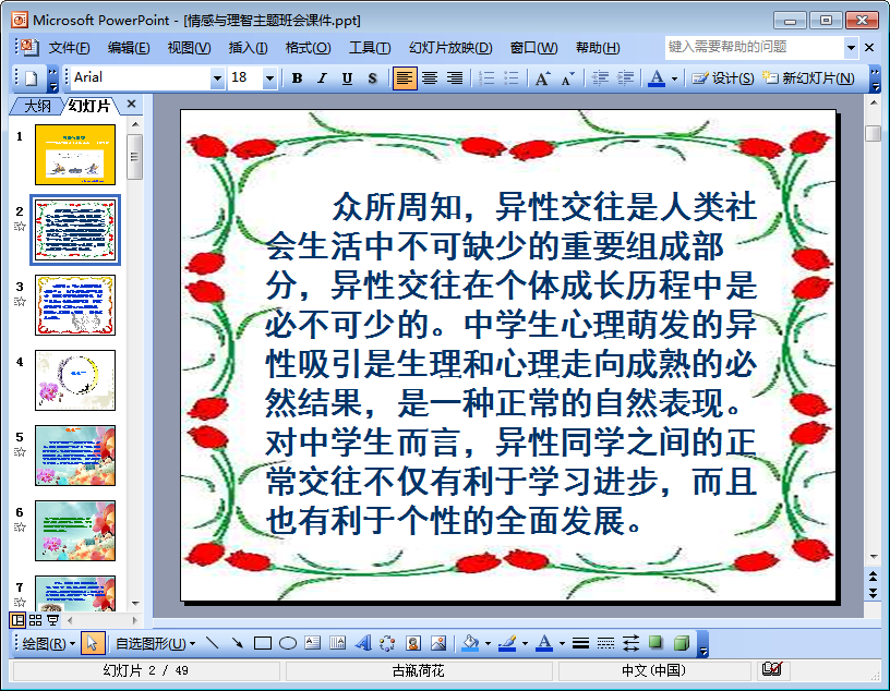 “莫让情感之舟过早靠岸”——这是一份情感与理智主题班会课件——一份关于男女生交往的主题班会课件。该ppt共49页,ppt主要探讨关于中学生早恋这一问题,下文是该情感与理智班会ppt的内容摘选及预览图,如果你想要查阅该ppt的全部内容的话,点击本文相应的下载地址进行下载即可!