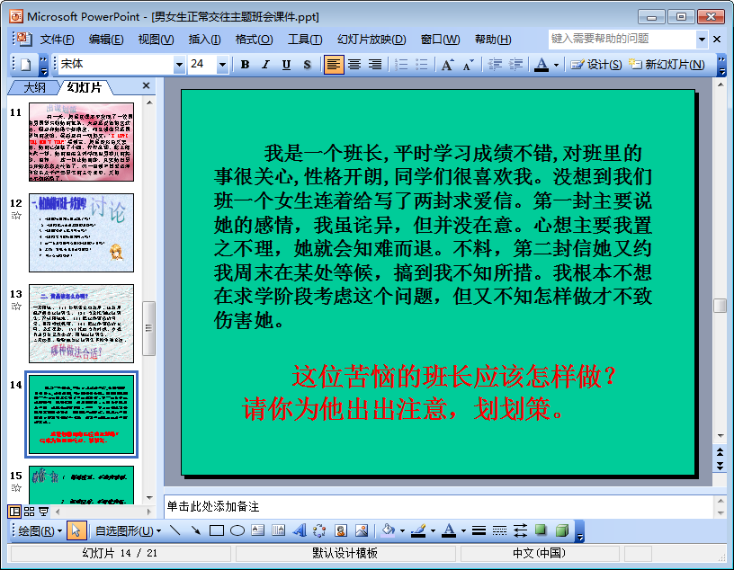 这份男女生正常交往主题班会课件主要围绕如何正确处理男女生之间的关系这一问题展开,ppt共有15页,内容图文并茂,十分生动,适合作为班会课件进行选取使用。下文是该男女生正常交往ppt的部分内容摘选,如果你想要查阅该ppt的全部内容的话,只需轻轻点击本文相应的下载地址进行下载即可!