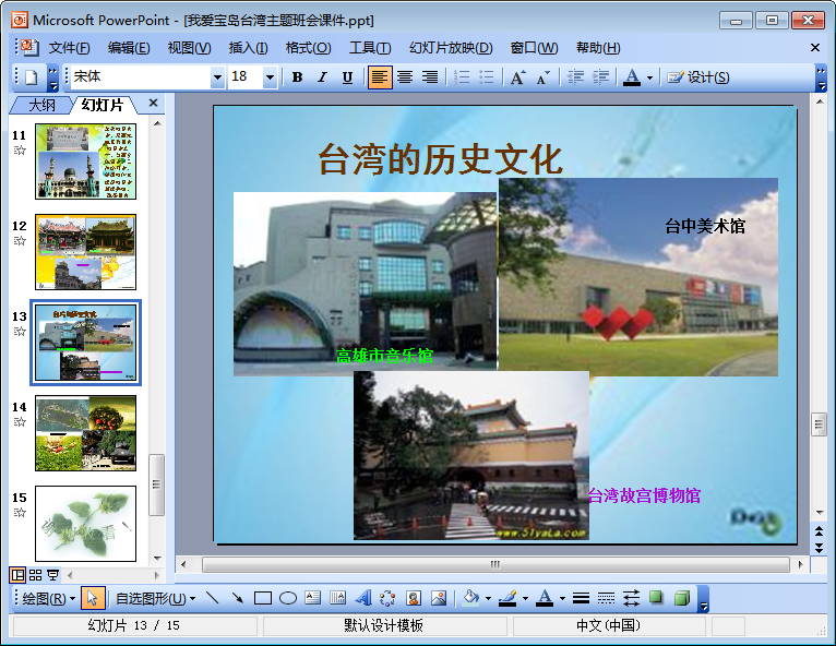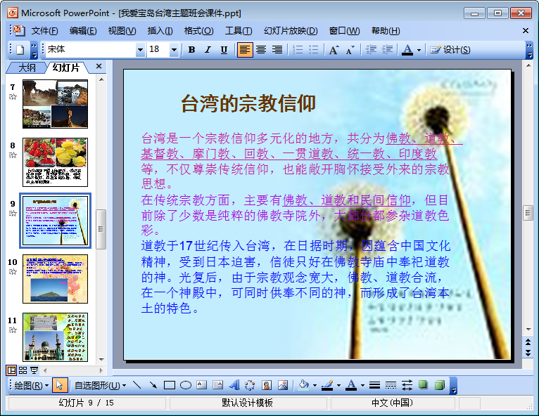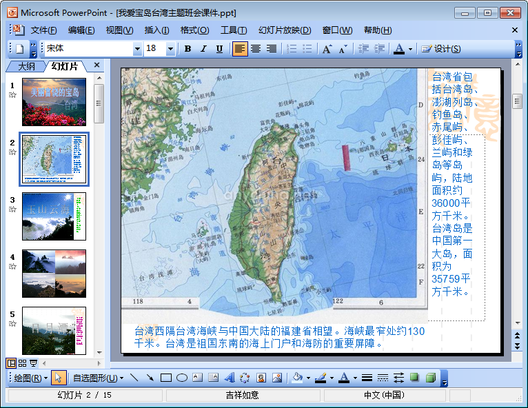 这是一份主题为“我爱宝岛台湾”的班会课件(以下简称为我爱宝岛台湾ppt)。该ppt共由15页组成,该ppt对台湾的历史文化、宗教信仰、名胜景点等都做了相关的介绍,需要一份关于台湾的ppt,或是需要我爱宝岛台湾ppt的朋友们赶紧来下载吧!