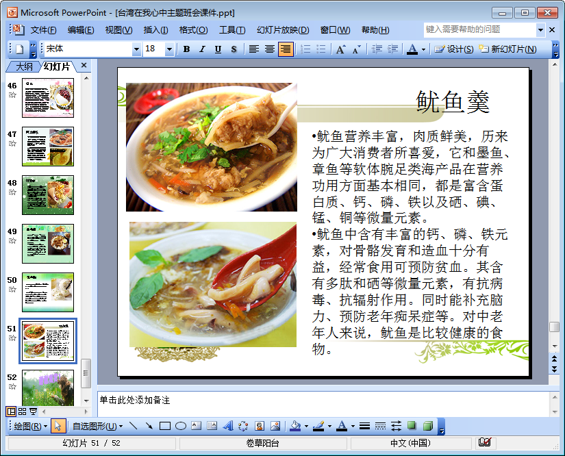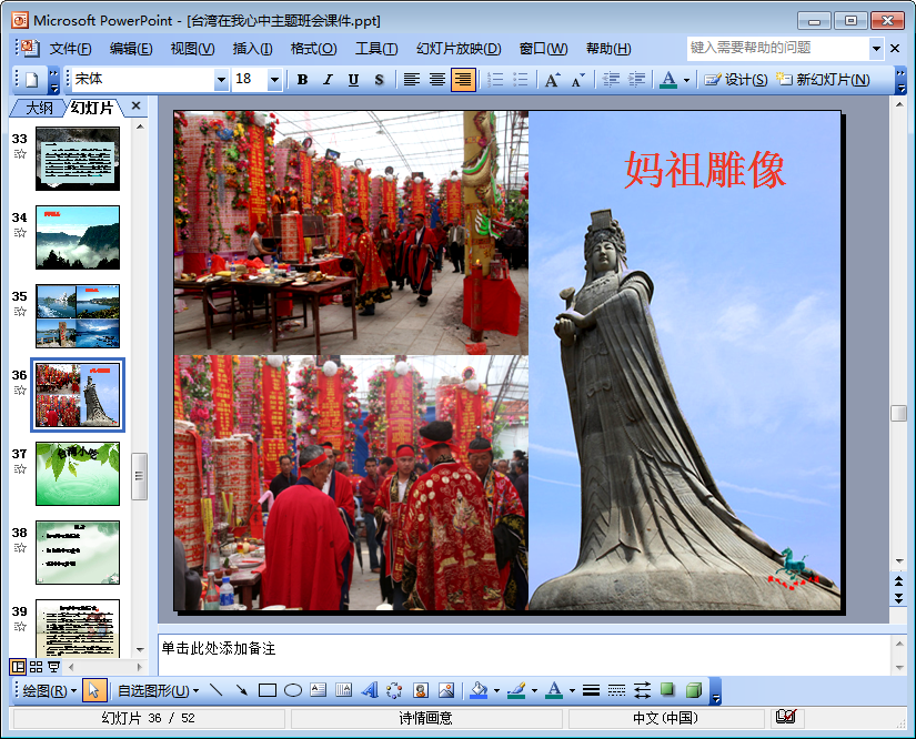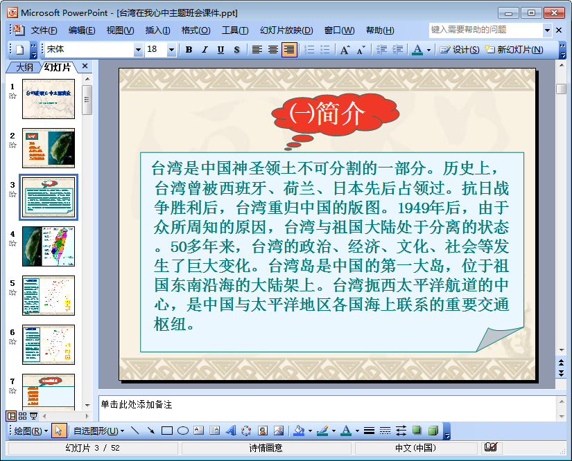 这份由52页组成的台湾在我心中主题班会课件(以下简称为台湾在我心中ppt)的内容主要包括对台湾的简介以及台湾地理人文、名胜与文化、经济发展状况、两岸经贸关系等详细介绍,是一份内容十分全面完整的ppt,欢迎有需要的朋友们前来东坡下载使用这份台湾在我心中ppt。