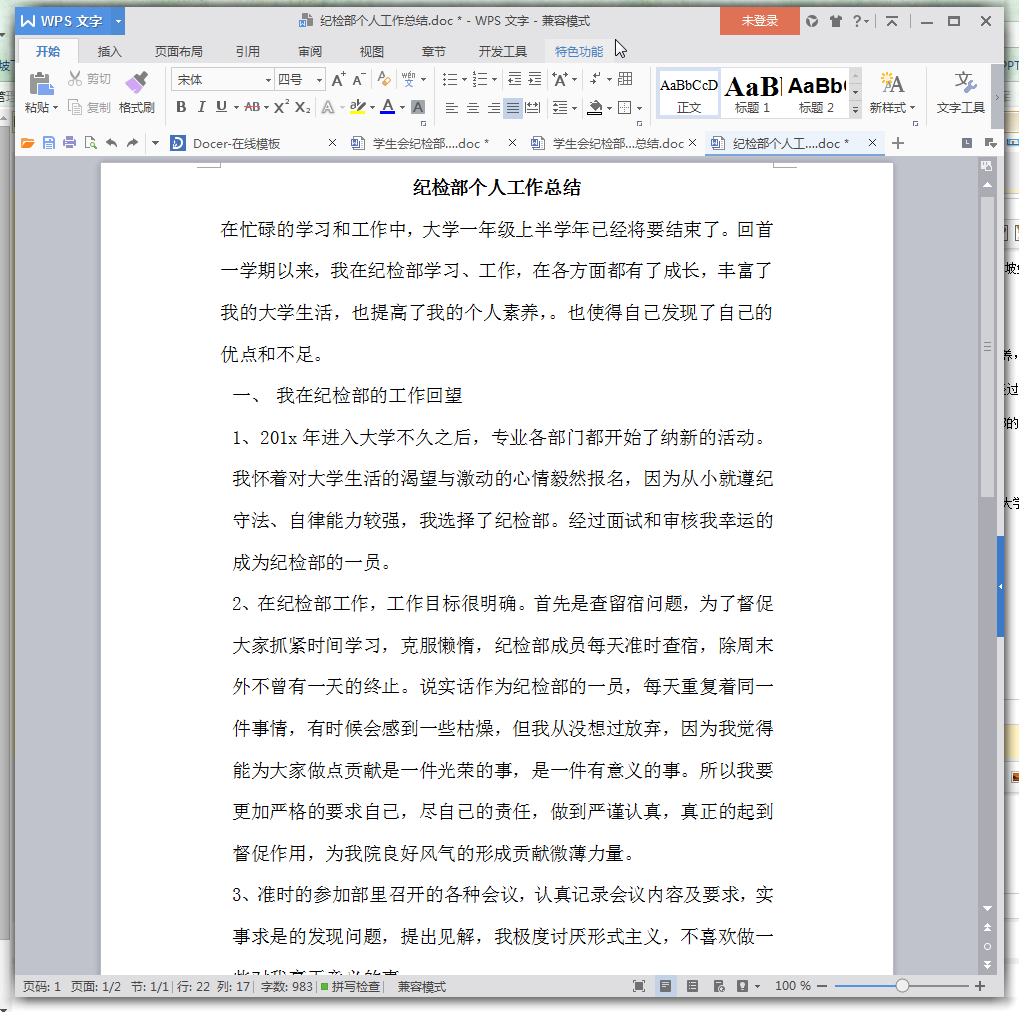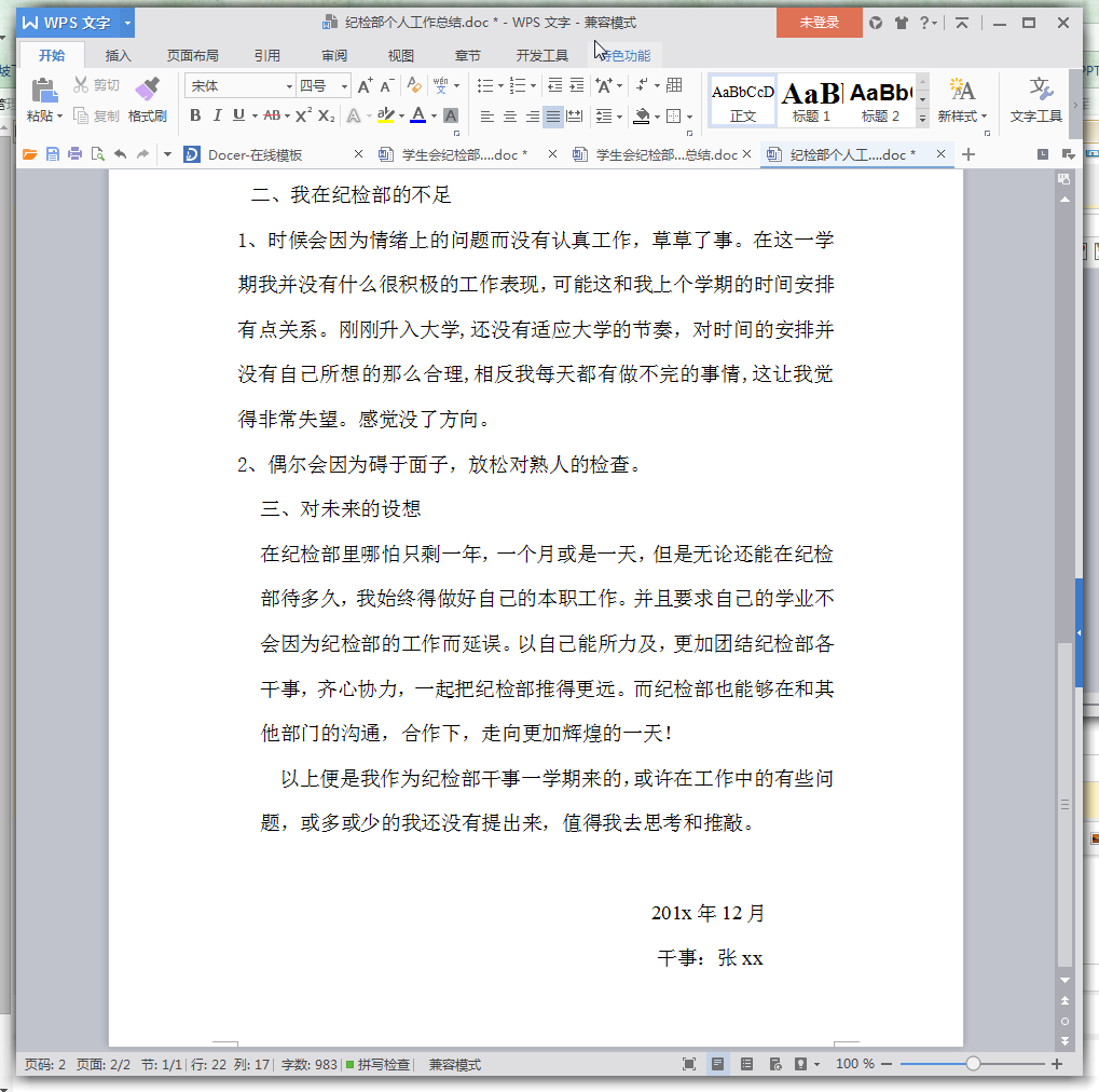 1、201x年进入大学不久之后,专业各部门都开始了纳新的活动。我怀着对大学生活的渴望与激动的心情毅然报名,因为从小就遵纪守法、自律能力较强,我选择了纪检部。经过面试和审核我幸运的成为纪检部的一员。