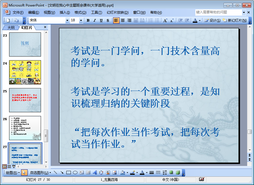 这是一份适合大学阶段的学生们进行查阅使用的主题班会课件——大学文明在我心中主题班会课件(以下简称为文明在我心中ppt),该ppt对大学生活中存在的不文明现象进行了详细的分析和解读,十分发人深省。下文是该文明在我心中ppt的部分内容摘选,相应查阅该ppt全部内容的朋友只需轻轻点击本文相应的下载地址进行下载即可!