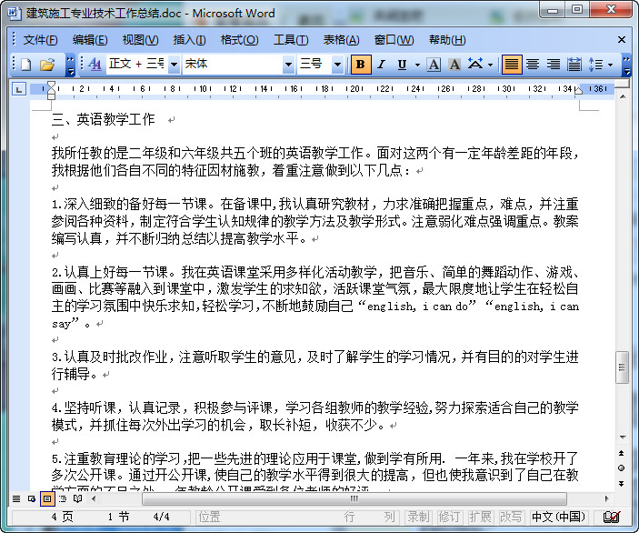 3、学校为了锻炼我的管理能力,我除了担任三年及的语文教师以外,我还做三年(1)的班主任,作为见习班主任,我积极参与了班级的日常管理。第一,我充分利用班会课,了解班级情况和学生们的心理状态,通过讲座、或讨论、或给他们讲充满人生哲理的故事来对学生进行思想教学。第二,关怀后进生、行为偏差生。后进生、行为偏差生是有着强大的自卑感难教育的一批。对此,我拿出了极大的耐心。通过家访、通信、谈话等形式使他们转变。 现在我们班级已经逐步变为一个充满团结向上风气的集体。