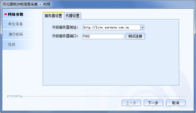 1. 网络参数设置 4 河北西安交大龙山软件有限公司 河北国税纳税人端信息采集软件简易操作流程设置【业务服务器】中“网上申报”的服务器地址和端口,确认无误后点击【测试连接】按钮,检测与申报服务器通讯是否正常。2. CA 设置 设置 CA证书文件具体操作步骤如下: