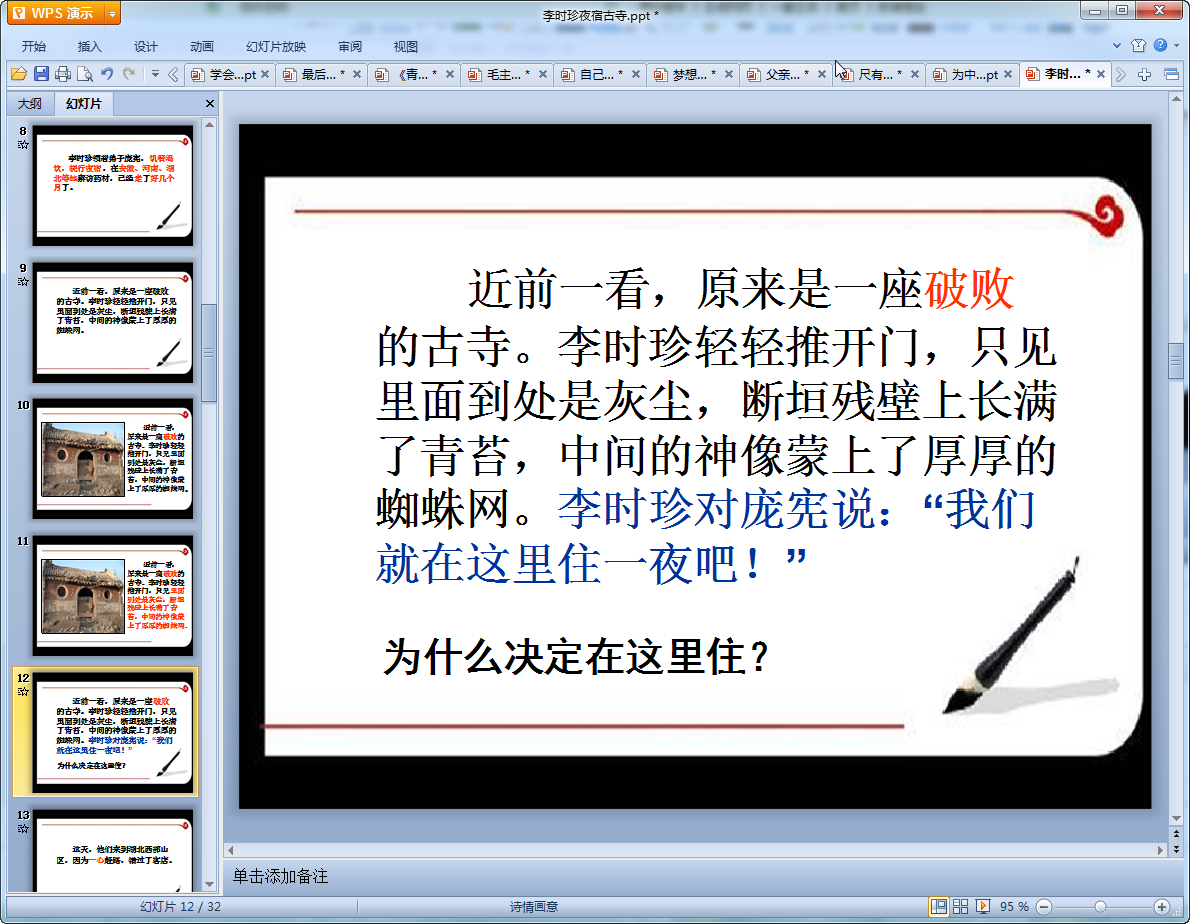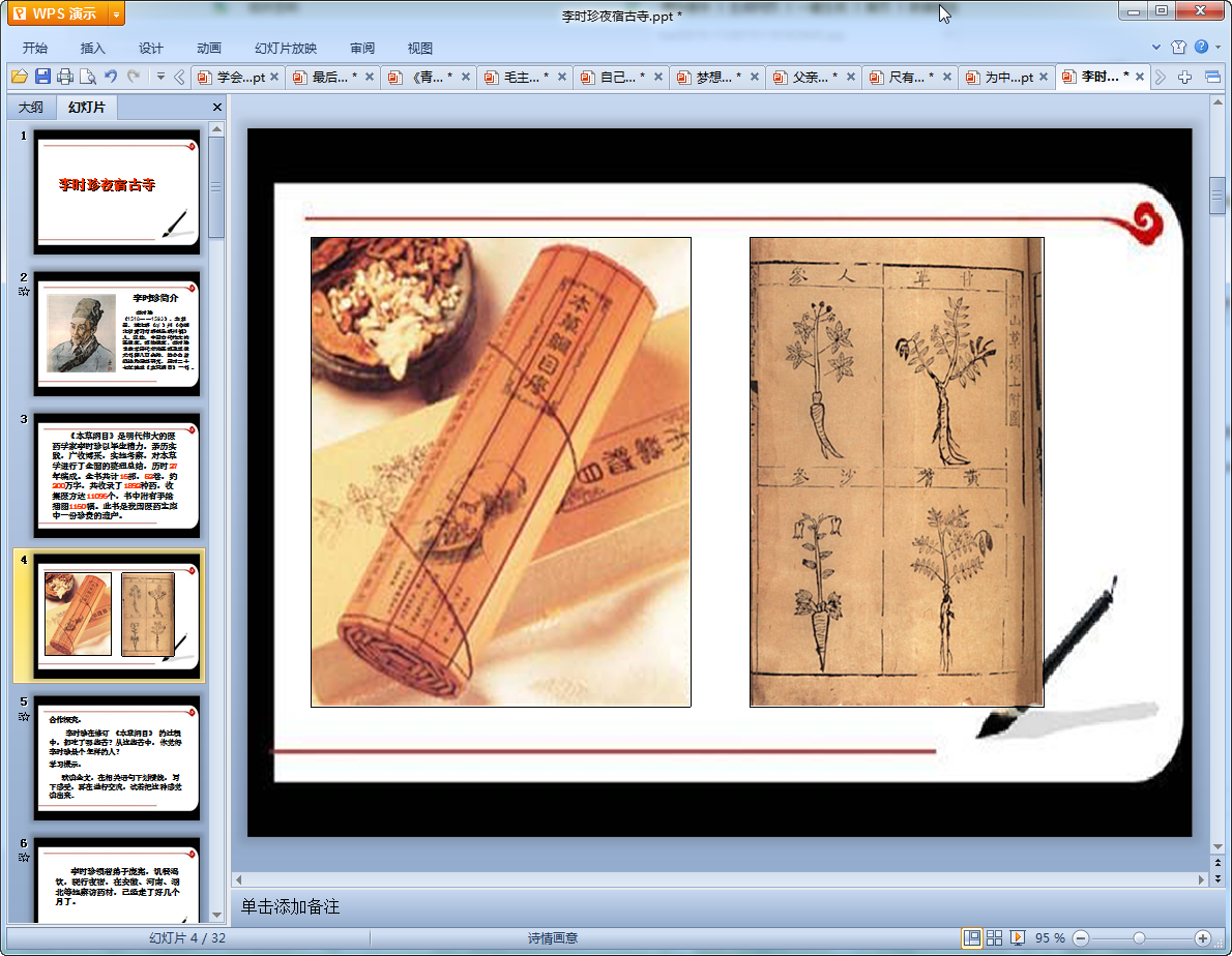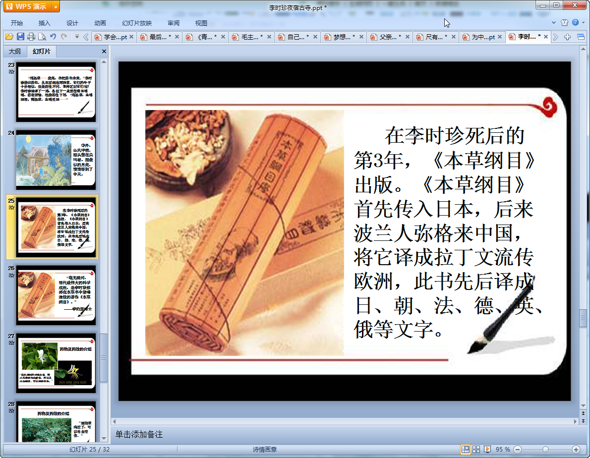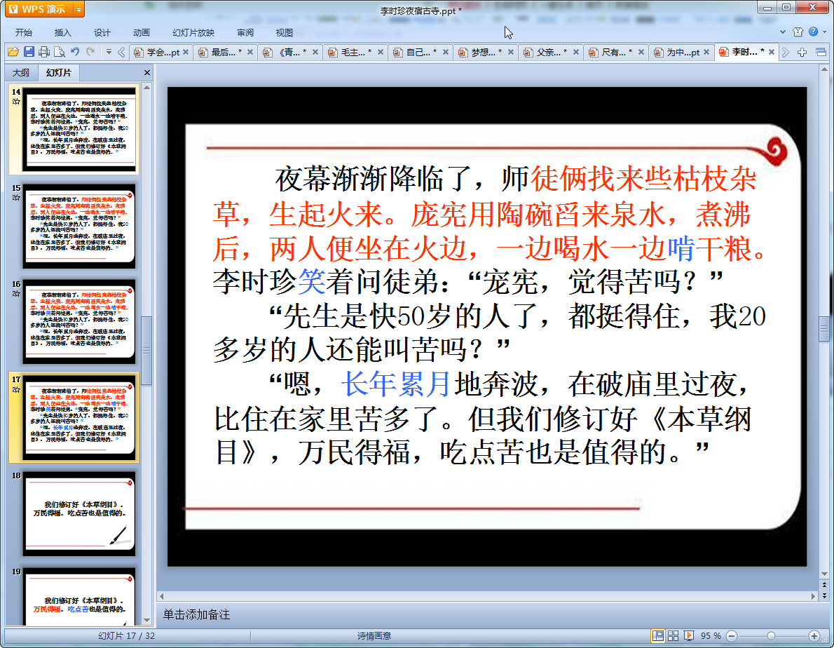 这里给大家带来的是一篇小学语文李时珍夜宿古寺教学课件,课件共有32页内容比较丰富,讲述了李时珍在修订本草纲目过程中经历的艰苦,有需要的老师们可以来我们东坡免费下载使用!