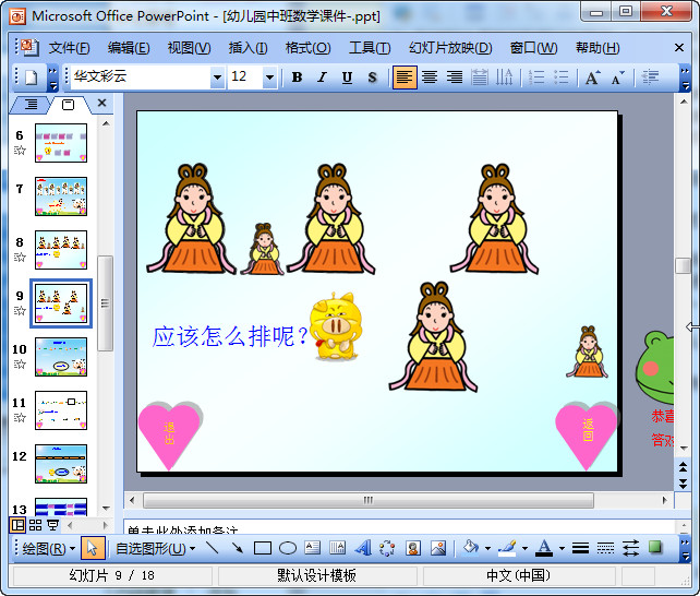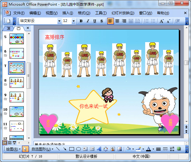 小朋友们的世界是缤纷多彩的,那么我们在做课件的时候,就要选取一些带有童趣的,色彩鲜艳的背景图片来做ppt,这份有趣的排序幼儿园中班优秀课件,就是这样子的,非常的适用,欢迎前来东坡下载使用。