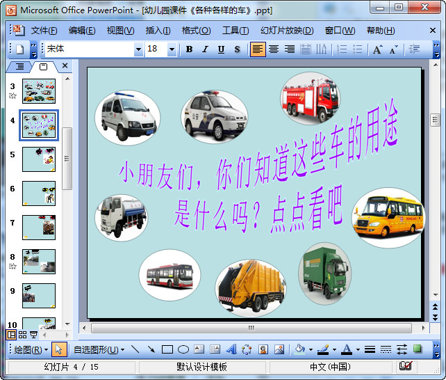 (2)重点学习几种特殊车的名称及用途。(消防车、救护车、洒水车)
