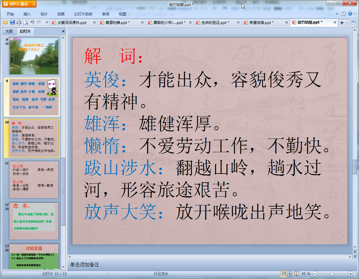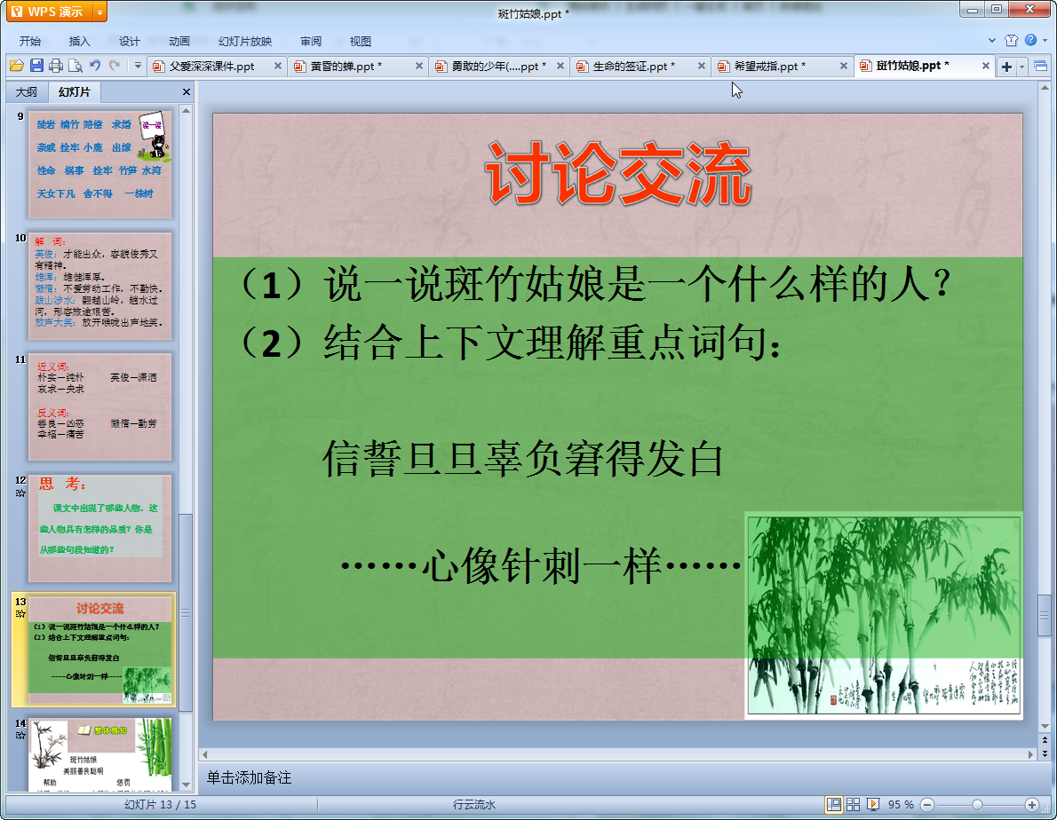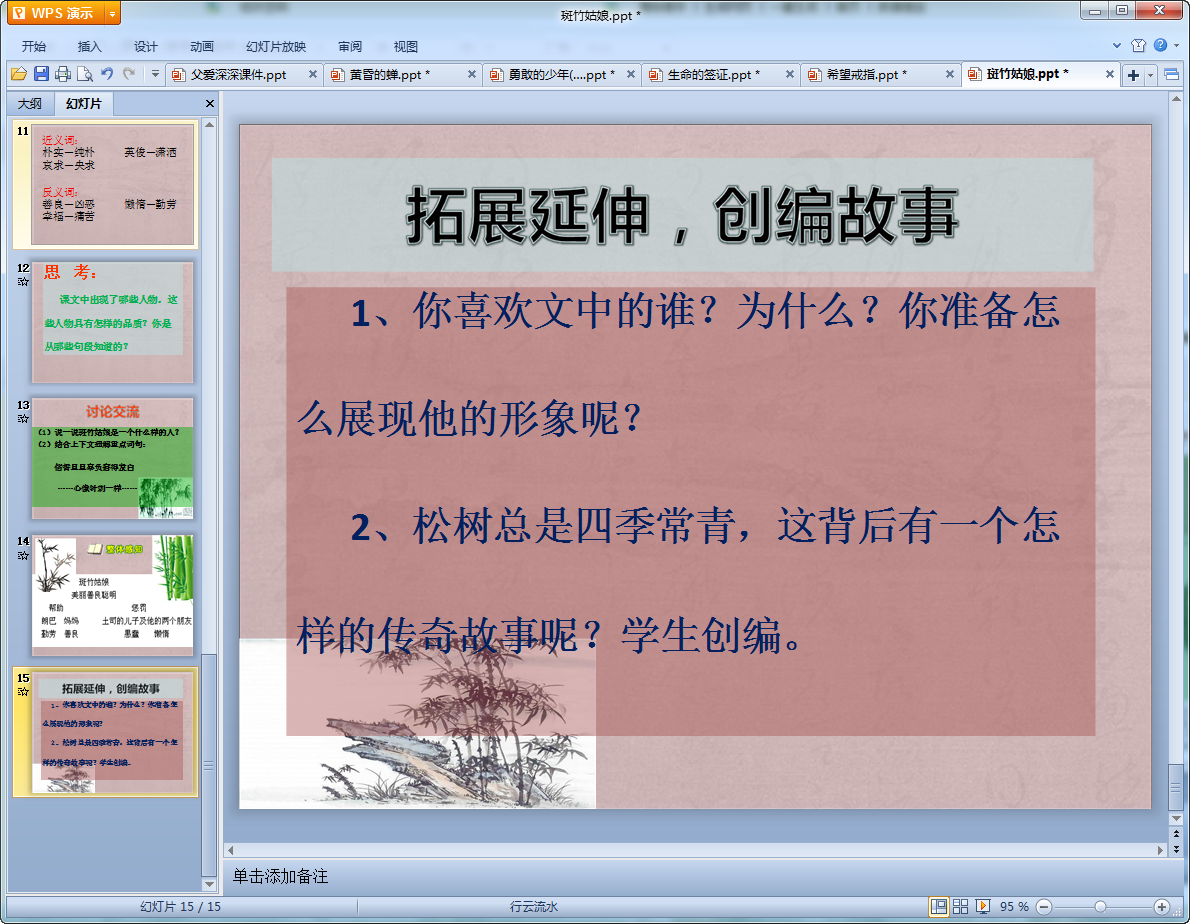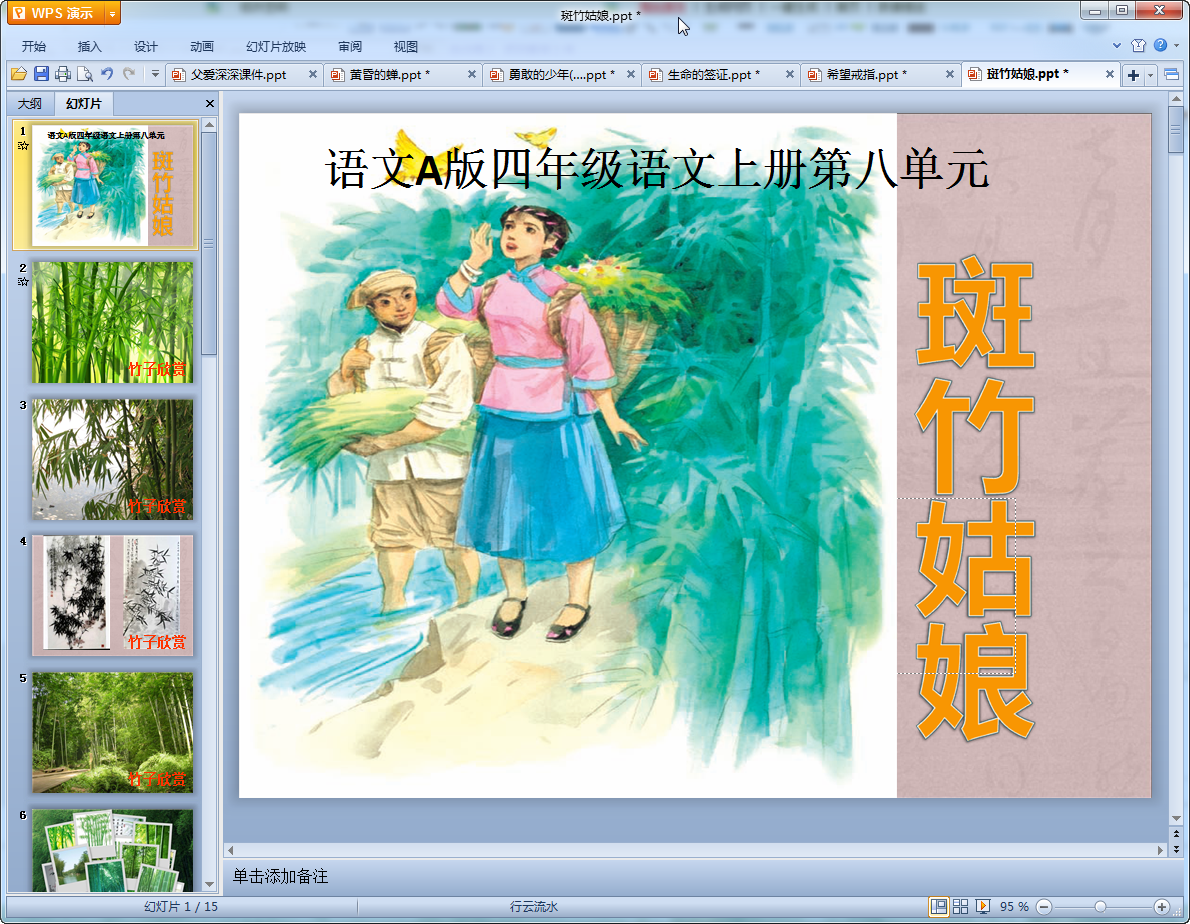 这里是东坡下载编辑整理的斑竹姑娘教学课件共有15页,内容十分丰富,精美的配图深受学生们的喜欢,课堂效果十分完美,非常不错的教学课件,有需要的朋友们可以来我们这边免费的下载使用!