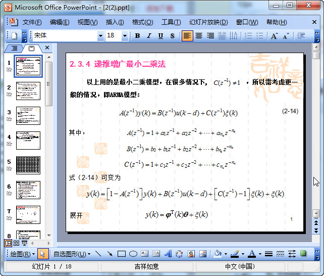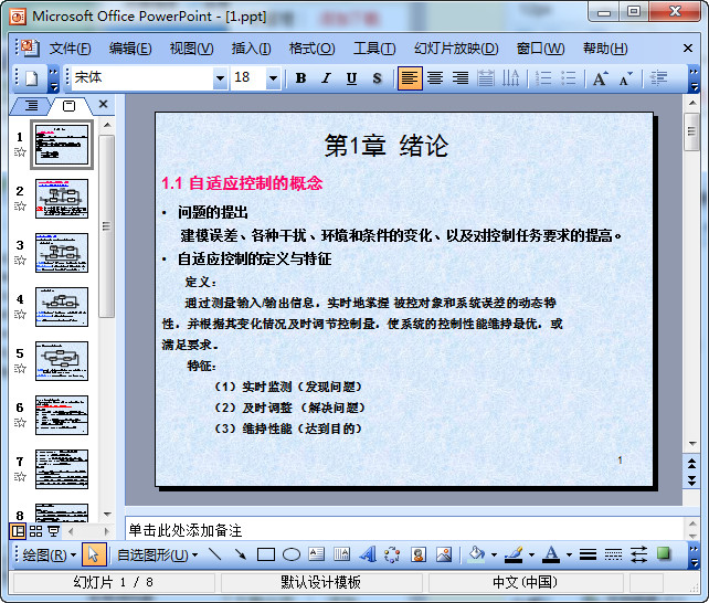 matlab自适应控制课件北航版,总共有14个ppt配套课件,是专门为自适应控制这本书籍教程而设置的课件,内容非常的丰富,将递推最小二乘估计、模型参考自适应控制和自校正调节器理论这些经典内容讲述的非常清晰。
