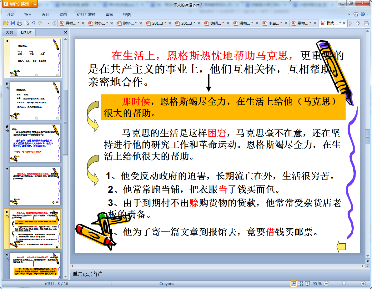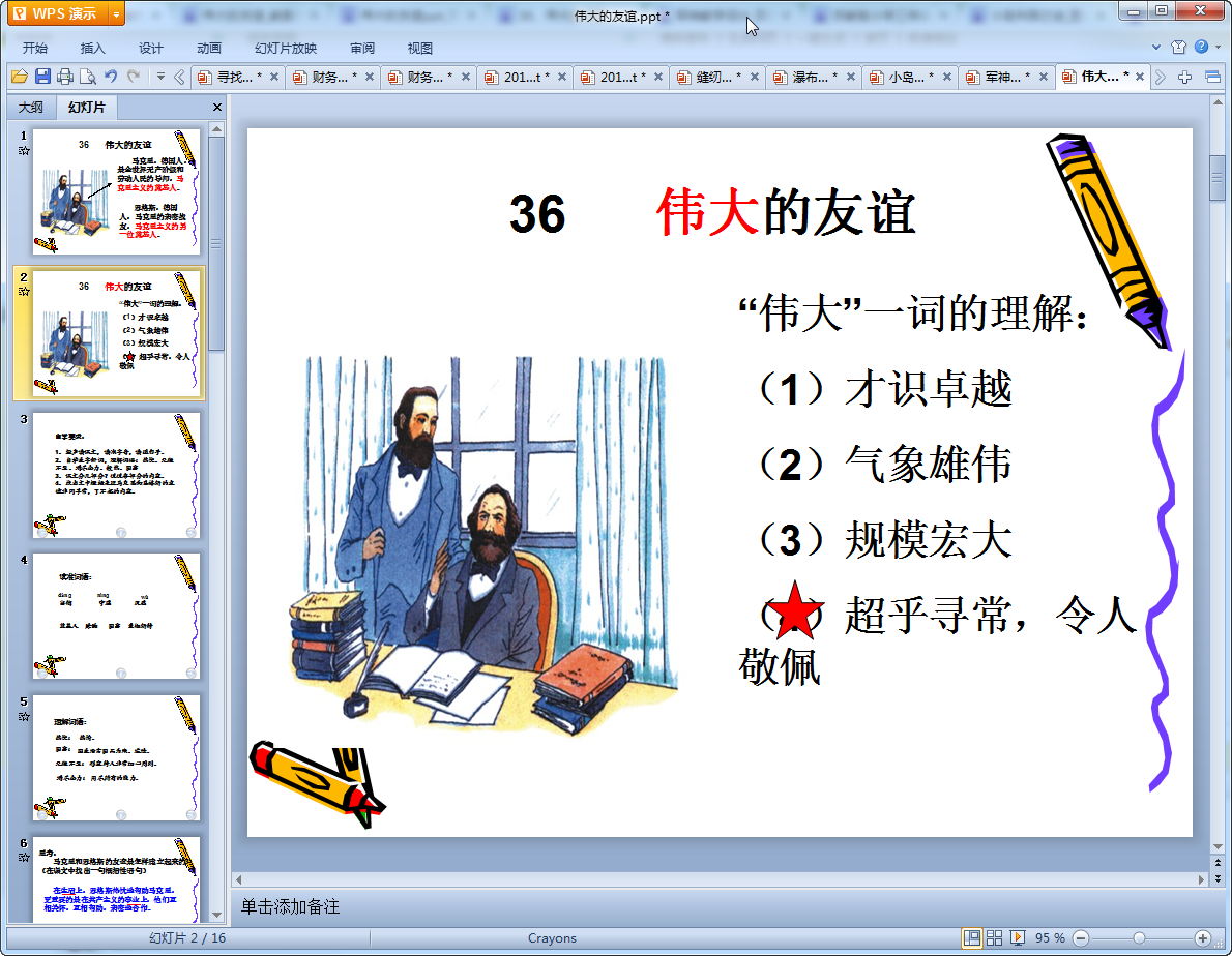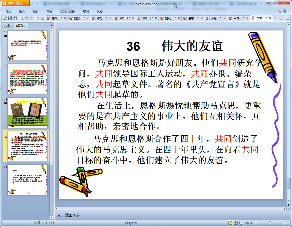 这是一篇小学语文课文中的伟大的友谊教学课件,讲述的是马克思和恩格斯的故事,该课件共有16页内容比较丰富,对课文中的知识点讲解的十分清楚,有需要的老师们可以来下载使用!不会让您失望!