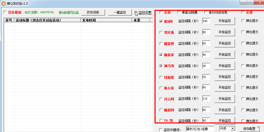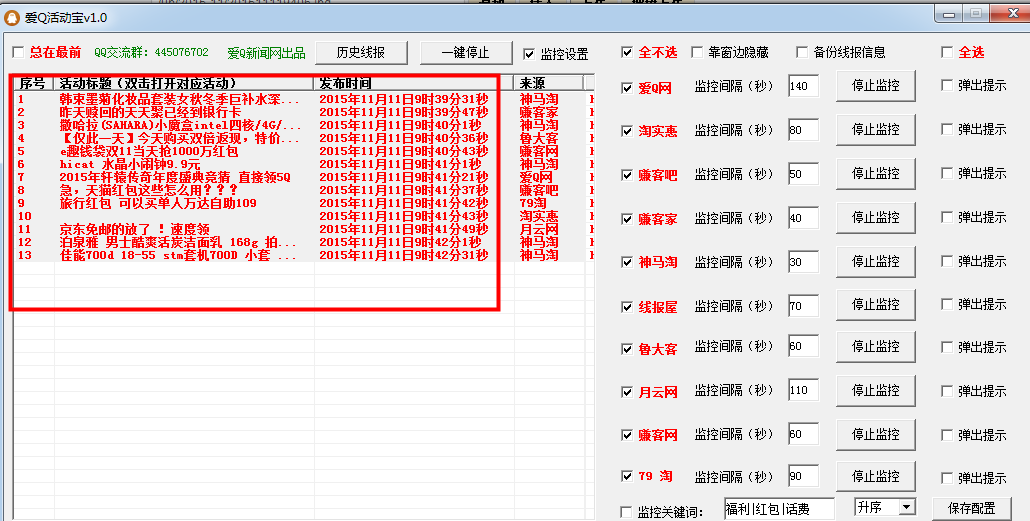 在任何大型节气的日子里面,总会有很多的优惠活动是你们不知道的,想要时刻了解。最好的还是备上知名线报网站活动监控软件,让大家每分钟都获悉最新的活动资讯!