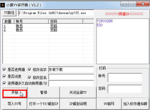 yy官方全自动多开器这个是由小夏工作室研发出来的歪歪多开神器。他能够直接突破系统管理限制,让你实现快速批量的挂账号,最重要是还支持yy的最新版本!喜欢的就直接下载!