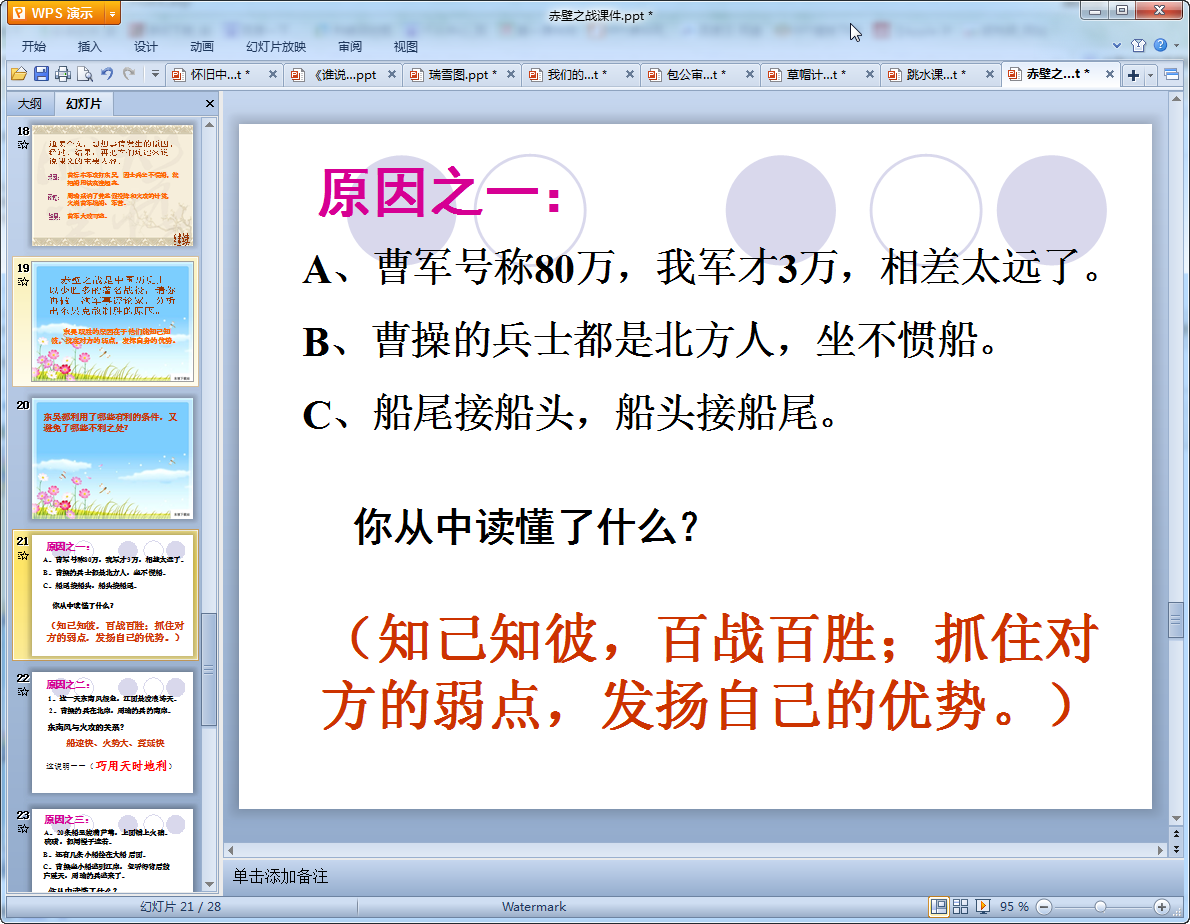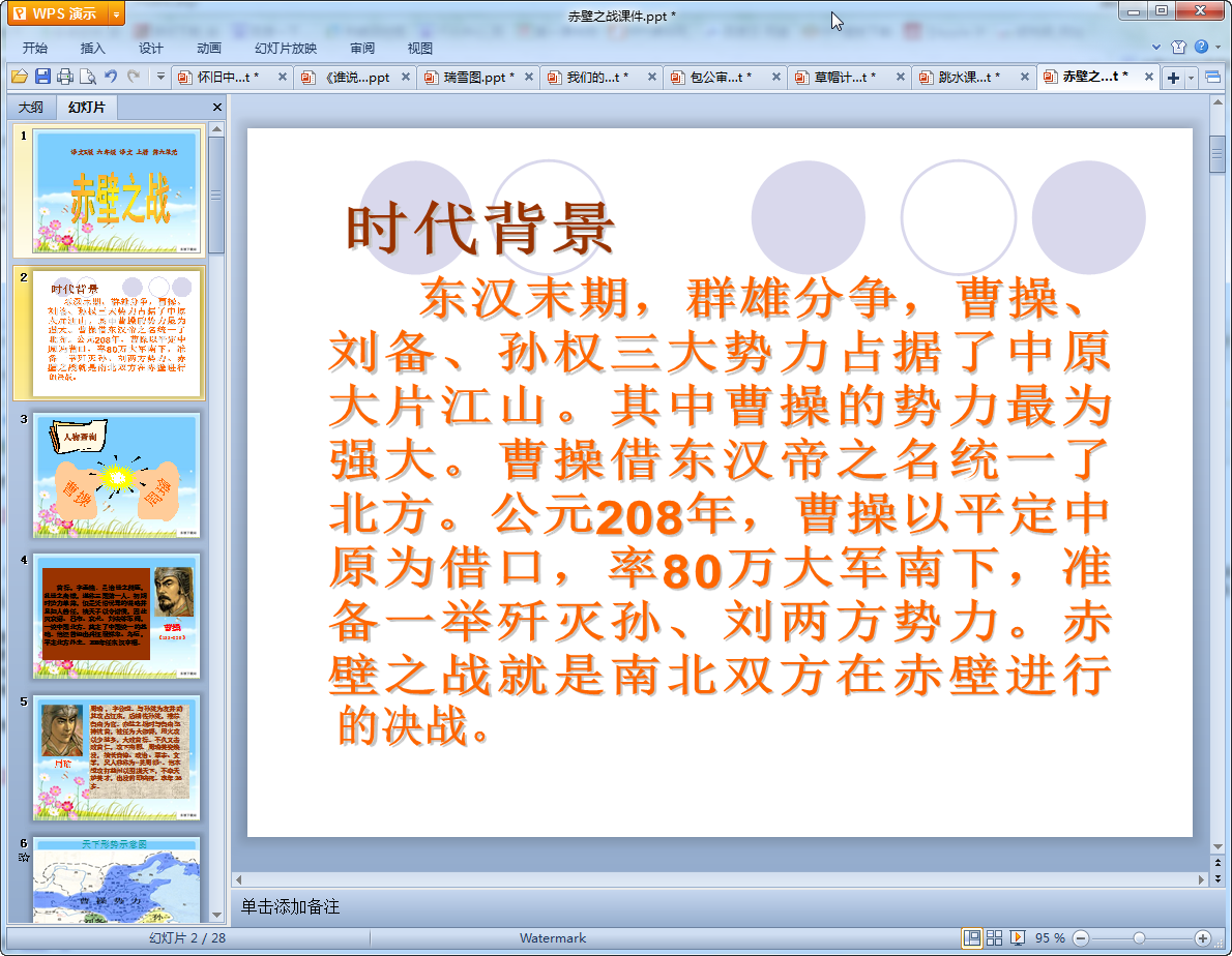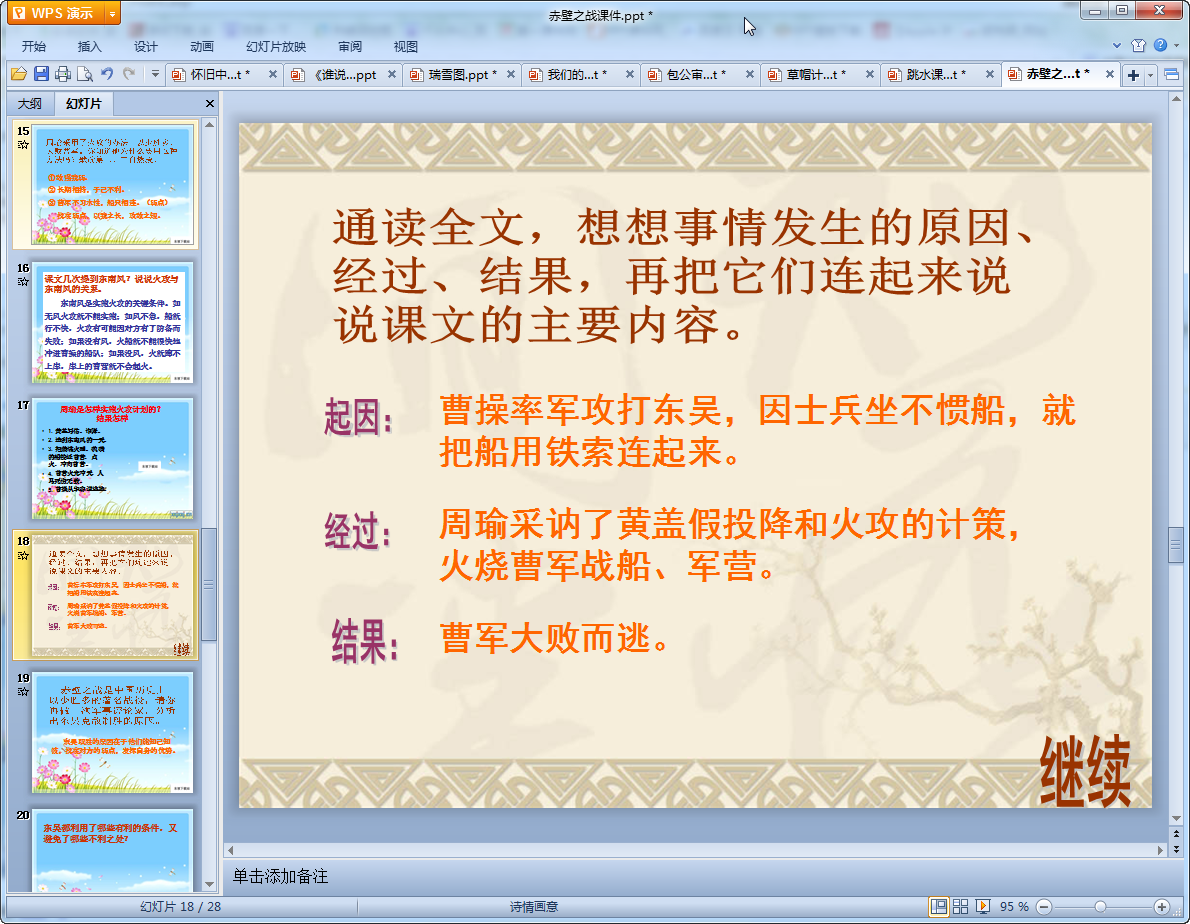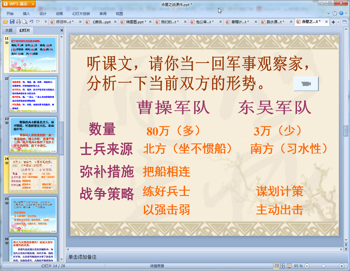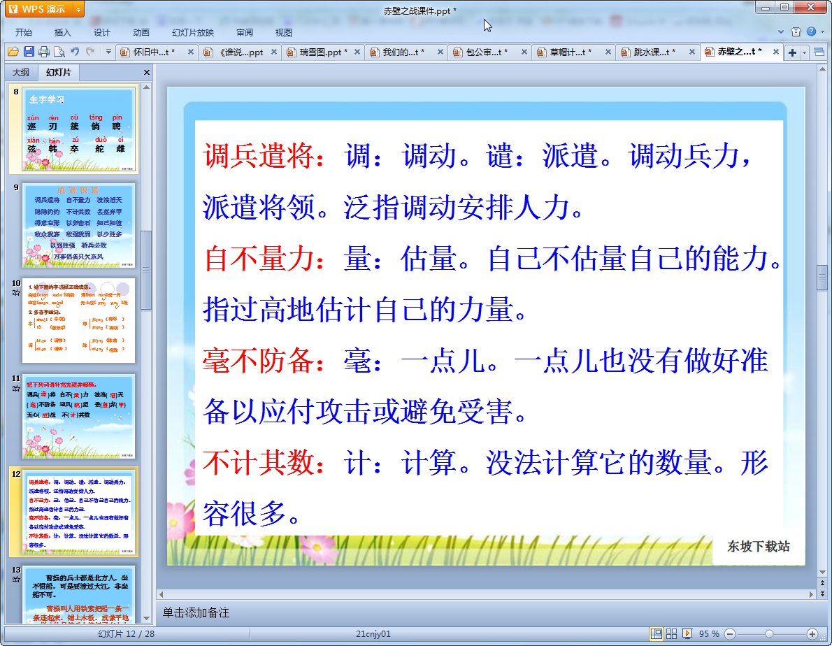 这东坡下载站编辑整理的赤壁之战教学课件,课件共有28页内容丰富,对课文中的知识点归纳的十分清楚完整,非常不错的教学课件能让学生们更快的学到知识,有兴趣的老师们可以来我们东坡免费下载使用!