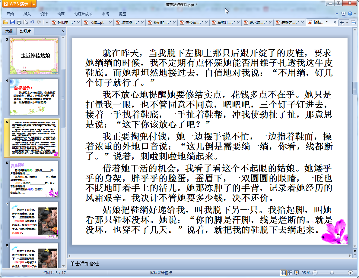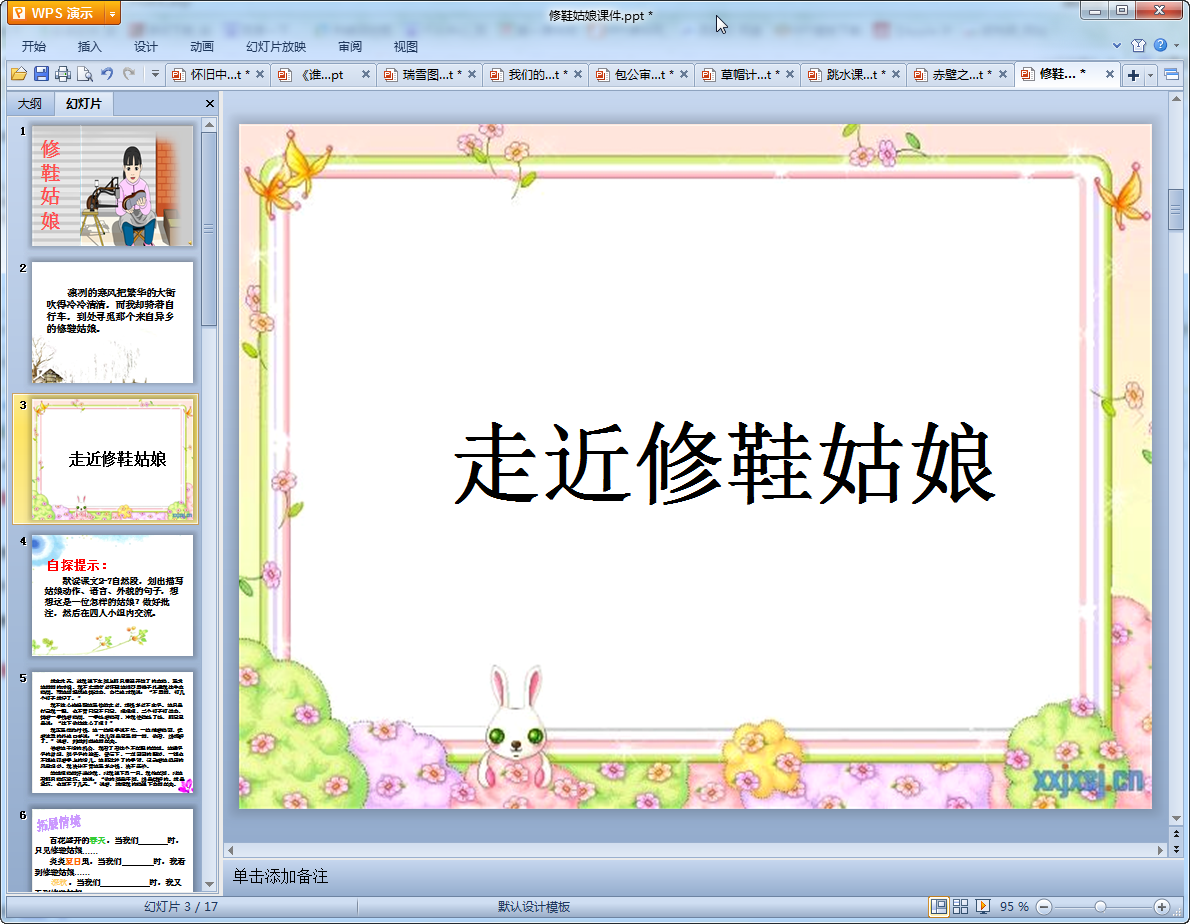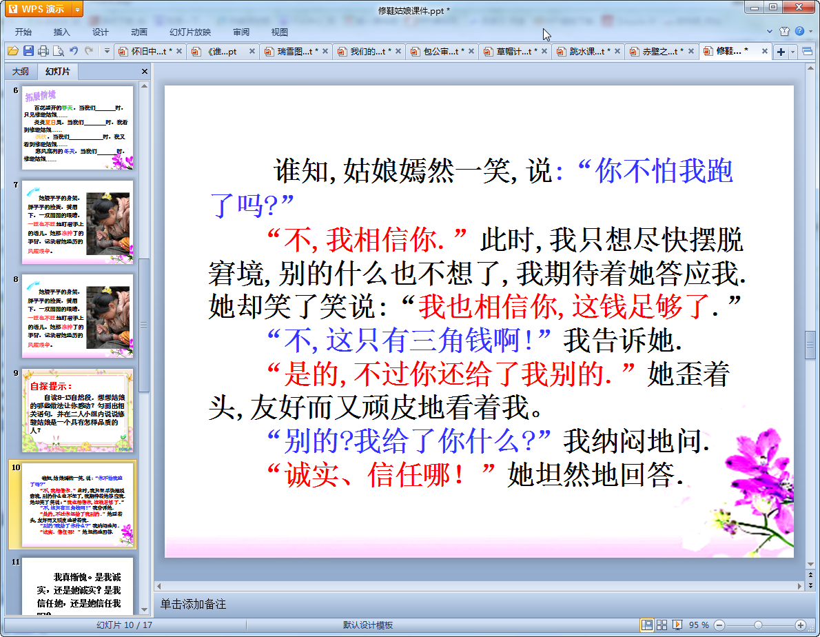 这是一篇小学语文教学课件修鞋姑娘ppt,该课件共有17页内容制作比较精细对课文的讲解十分完整,通过一件小事来告诉同学们信任和诚实的含义,具有教育意义的一篇课文,有兴趣的老师们可以使用该课件教学,不会让您失望!