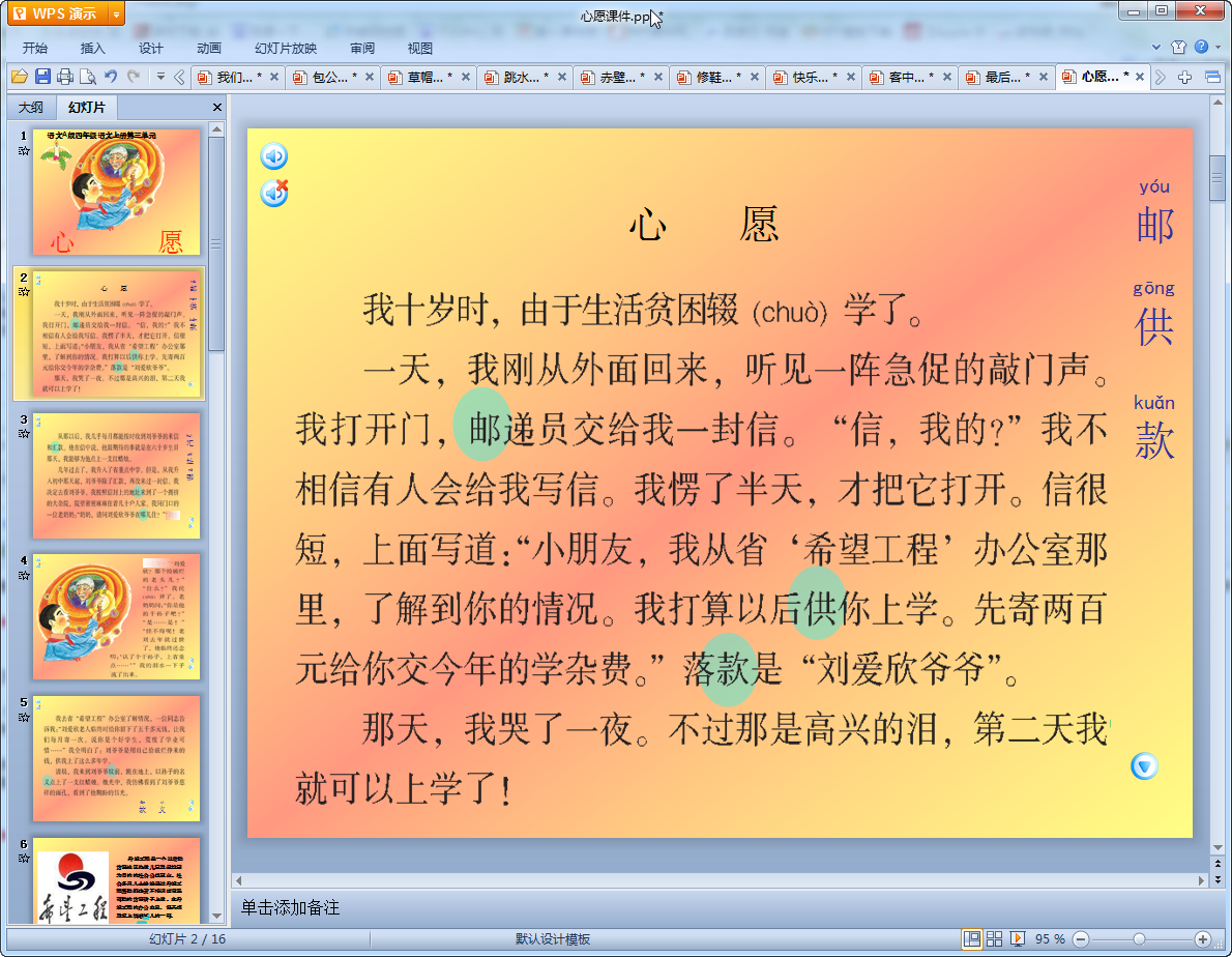 这是哦我们东坡下载编辑整理的心愿ppt课件,课件共有16页制作精美,讲述了生活的困难的老爷爷资助一名学生上学的感人故事,正在寻找该课文课件的老师们可以就使用这篇,我们为大家提供免费的下载!不会让你们失望的课件!
