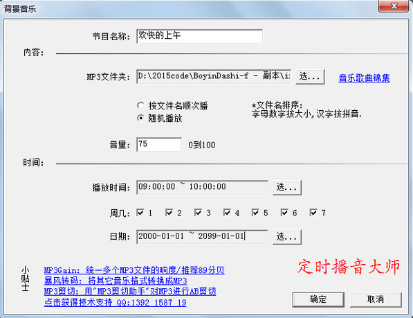 定时播音专家破解版,专业的电脑定时播音软件,定时自动播放音乐或文字播音,通过将电脑音频输出连接至功放,即可打造一套简单易用的商场播音系统,有需要的赶紧来下载使用吧。
