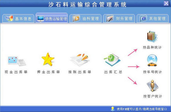 2.销售运输管理包括现金出库单、押金出库单、挂帐出库单、出库统计(按品种统计、按车号统计、按客户统计)。