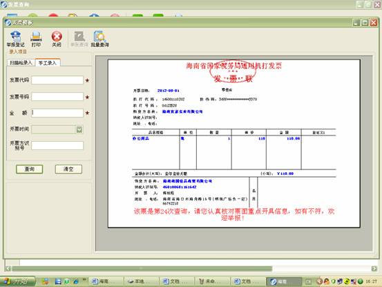 (1)扫描枪录入方式适用于印有二维码的海南国税发票票种查询,如通用平推、卷式机打发票等,通过二维码扫描枪扫描所查发票票面的二维码后显示查询结果,如果已开具,则提供发票开具的详细信息: