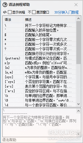 感谢小Z推荐了一款非常好的(但是个别子匹配项多时卡顿.应该是我的表达式问题)故而花了点时间照着“抄”了一个,并配上语法与经典例程(部份摘自泪闯天涯正则工具)供新手学习