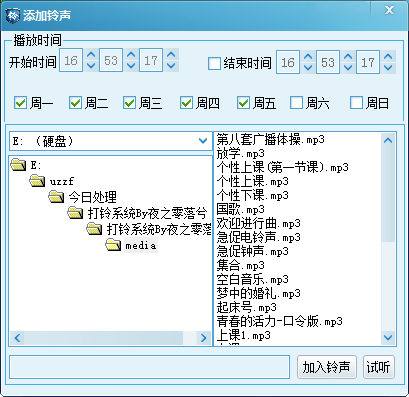 超级打铃软件破解版是一款简单易用安全的打铃软件系统。只要你稍微熟悉windows,就会使用本软件。本软件可以设置每个星期周期性的铃声,可以设置播放时间和停止时间,也可以播放音乐文件夹,播放文件夹音乐时还可以随机播放歌曲,让播放的歌曲不在枯燥。同时,你也可以自由下载自己的音乐铃声、播放歌曲。