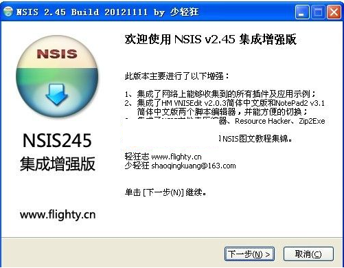 轻狂NSIS增强版除了主程序的翻译之外还把主要的文档作了翻译并修正了官方版本里简体中文语言习惯用语不合适之处。单纯的使用脚本来编写安装程序对于大多数人来说不仅困难而且容易出错,为此,增强版里集成了一个相当好用的脚本编辑器 - vnisedit。只需要根据向导就能轻松的做出很酷的安装程序,甚至,你还可以在向导里给你的安装程序添加启动画面、让你的安装程序在安装过程中播放音乐,而这,只需要点几下鼠标即可。除此之外,vnisedit 附带的注册表转换插件还可以把 .reg 文件一次性的转换为 nsis 脚本,补丁制作向导可以一次性地为你生成体积超小的补丁升级程序。此增强版还在官方版本的基础上集成了一些有用的插件,比如 findproc 可以根据可执行文件名查找进程是否在运行,这在制作补丁程序或者是汉化包时非常有用。由于各个组件在使用时各自独立,所以强烈推荐安装全部组件。