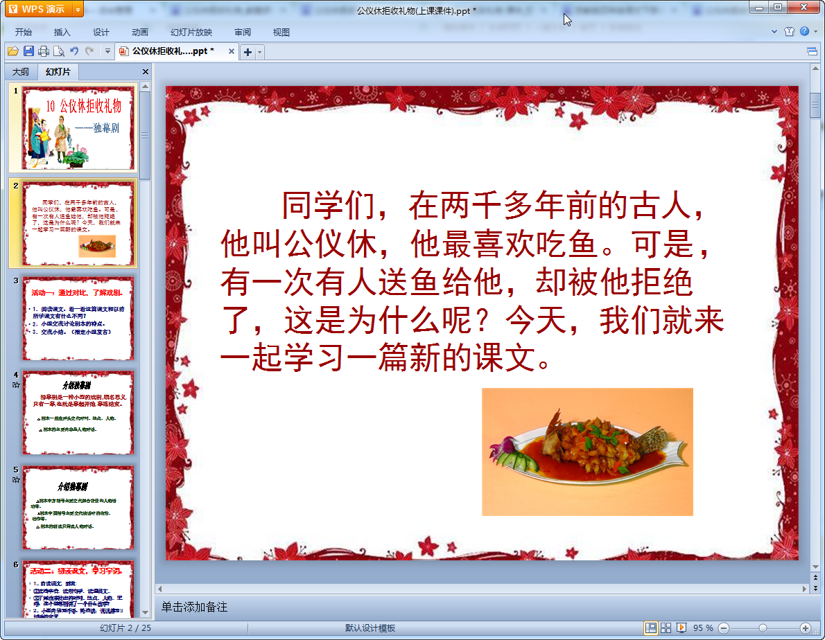 同学们,在两千多年前的古人,他叫公仪休,他最喜欢吃鱼。可是 ,有一次有人送鱼给他,却被他拒绝了,这是为什么呢?今天,我们就来一起学习一篇新的课文