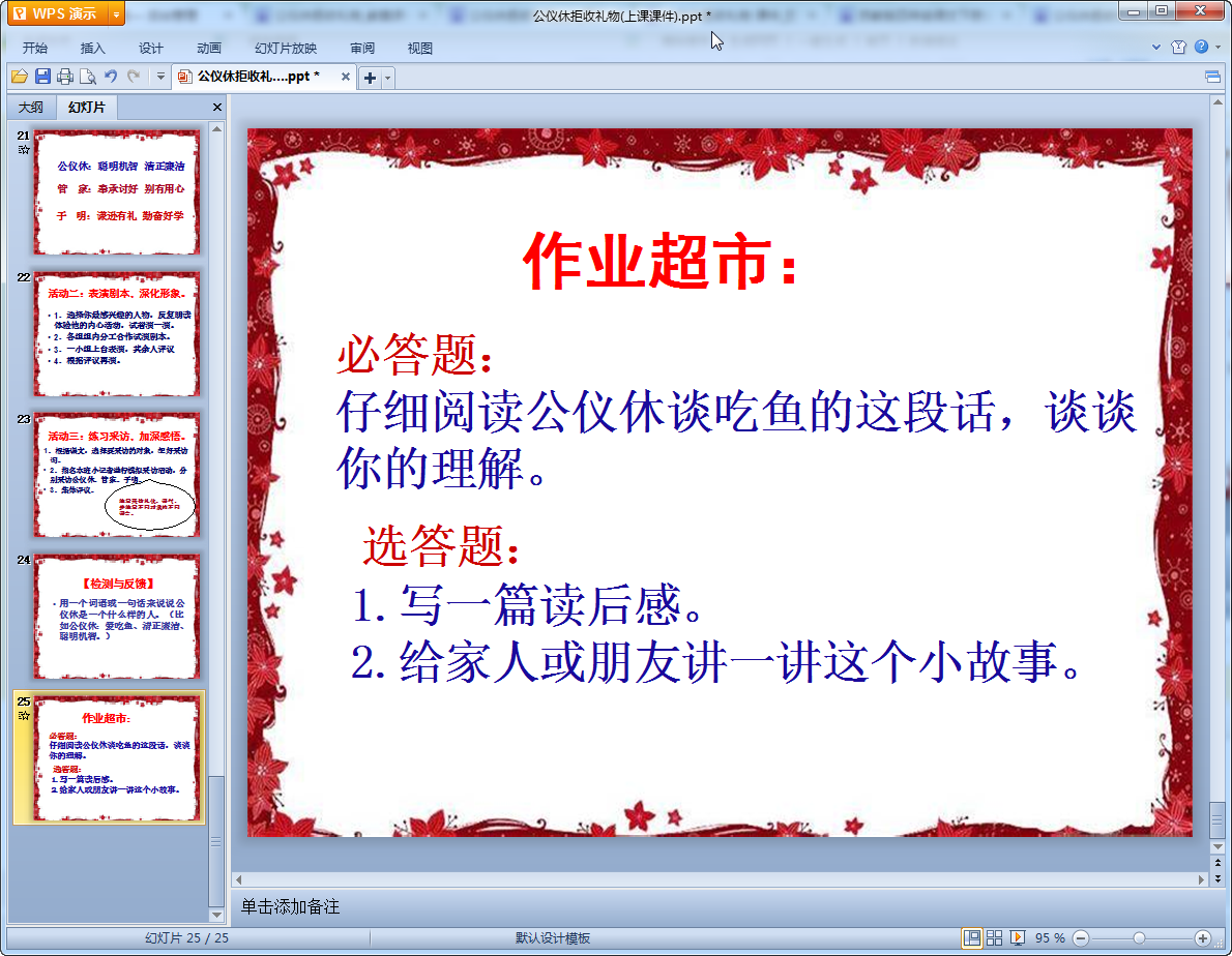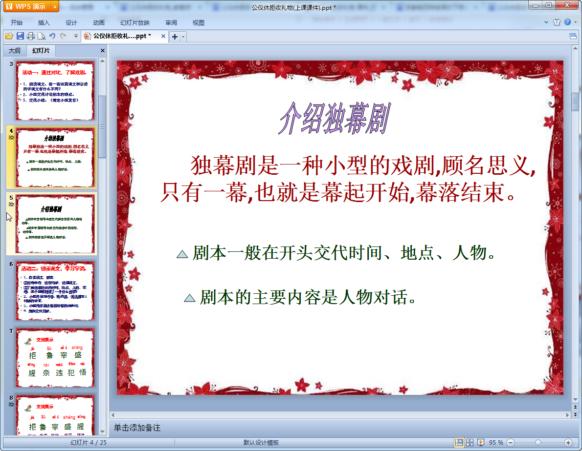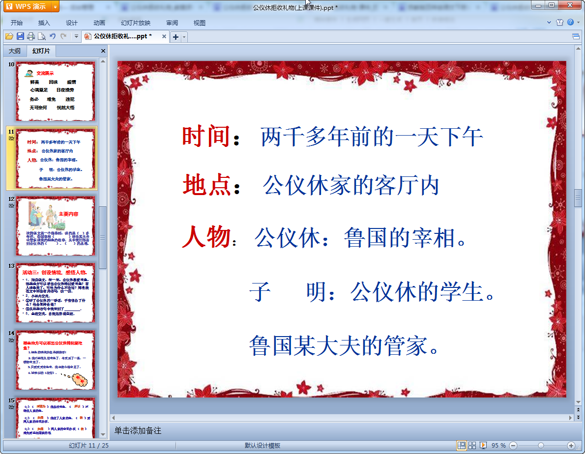 这是一篇苏教版小学四年级下语文公仪休拒收礼物教学课,该课件共有25页内容比较丰富,对课文中的重点字词讲解的十分清楚,有需要该课件的老师可以来我们东坡免费的下载使用!