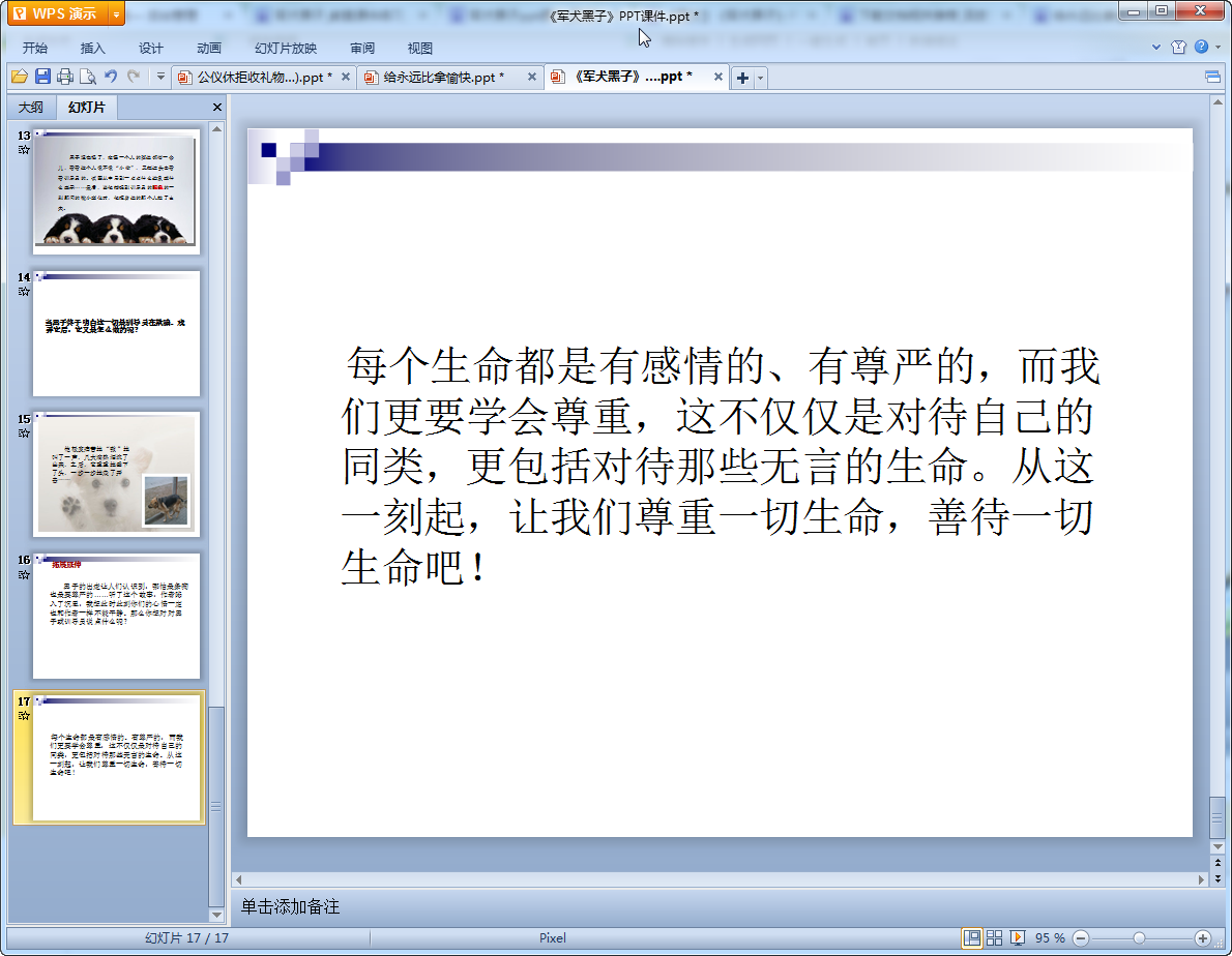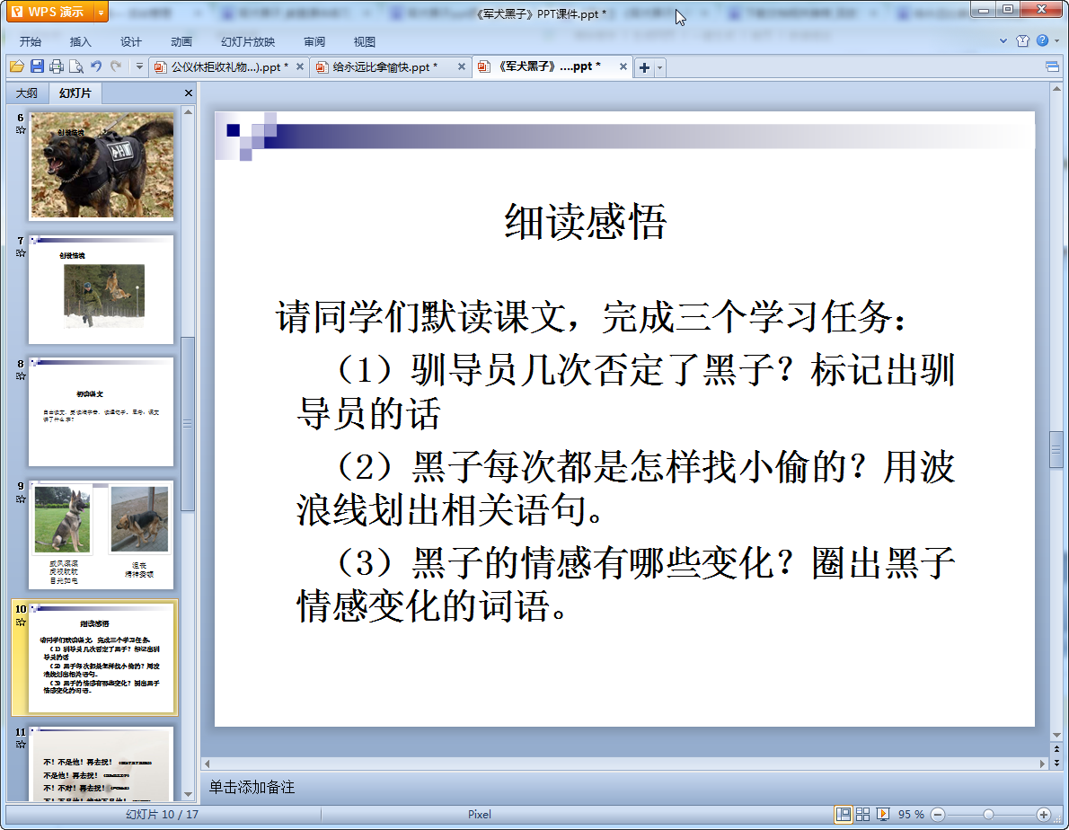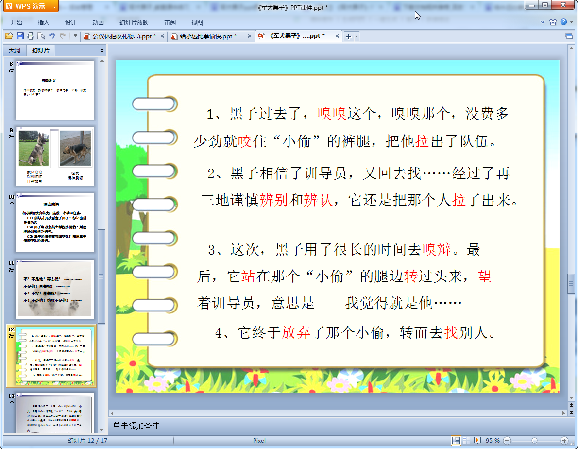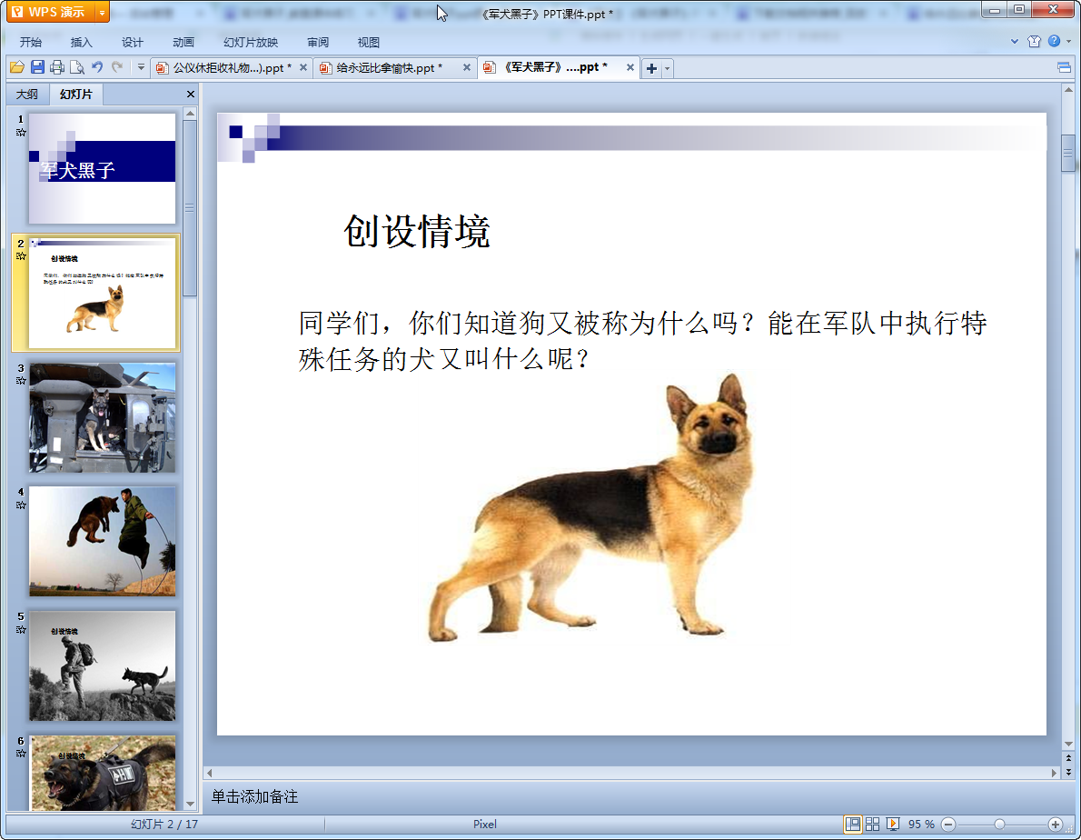 这是科教版小学五年级语文军犬黑子教学课件,课件共有17页内容十分丰富添加了许多配图深受学生们的喜爱,非常不错的教学课件,能够有效的吸引到学生们的注意力。有需要的老师们可以免费的下载使用!