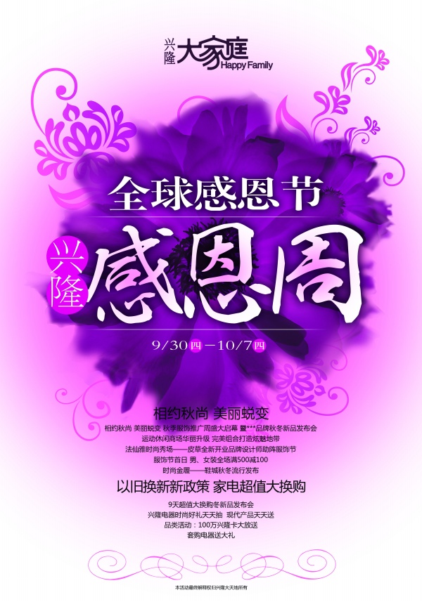 相约感恩,美丽蜕变。今天东坡小编为各位带来的是一份全球感恩节海报设计psd素材,全幅图片以奢华的紫色为底色,十分的精美大气,有内涵。欢迎有需要的朋友前来下载。
