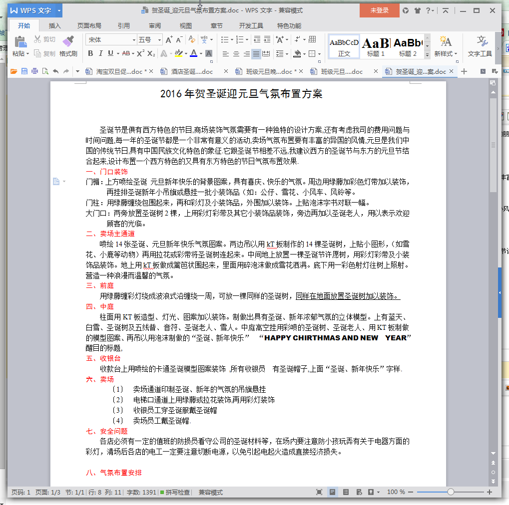 圣诞节是俱有西方特色的节目,商场装饰气氛需要有一种独特的设计方案,还有考虑我司的费用问题与时间问题,每一年的圣诞节都是一个非常有意义的活动,卖场气氛布置要有丰富的异国的风情,元旦是我们中国的传统节日,具有中国民族文化特色的象征.它跟圣诞节相差不远,我建议西方的圣诞节与东方的元旦节结合起来,设计布置一个西方特色的又具有东方特色的节日气氛布置效果.