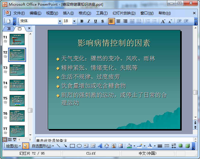 糖尿病健康知识讲座课件,总共有95页,内容非常的丰富,首先是从糖尿病的定义以及症状讲起,对各个状况进行了具体的分析,十分的清晰,采用图文的模式,十分的不错。欢迎有需要的朋友前来东坡下载使用。