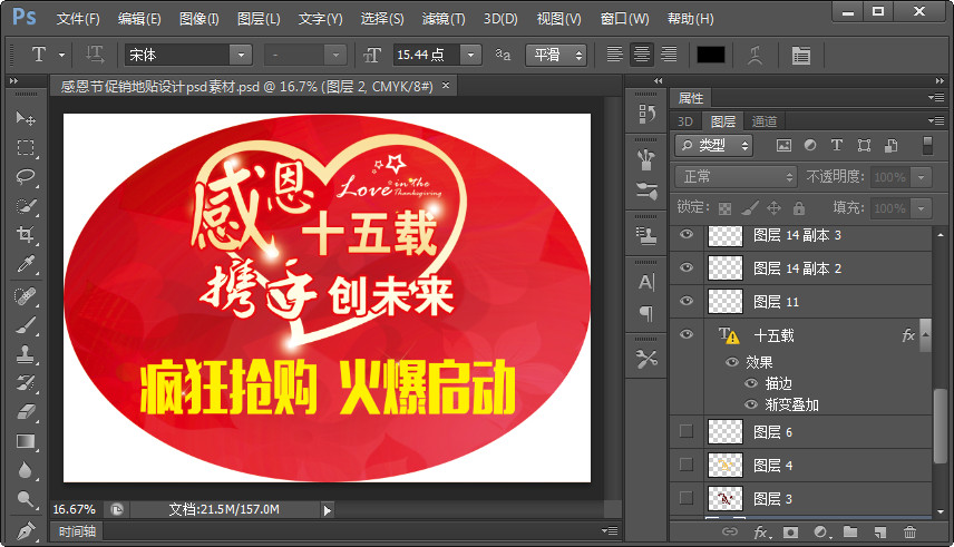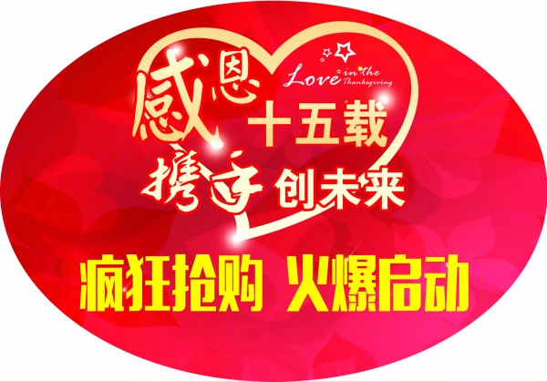 感恩十五载,携手创未来。疯狂抢购,火爆启动。感恩节促销地贴设计psd素材,一份完美的psd促销素材。十分的精美,给人一种热抢当中,气氛十分的活跃。欢迎有需要的朋友前来东坡下载使用。