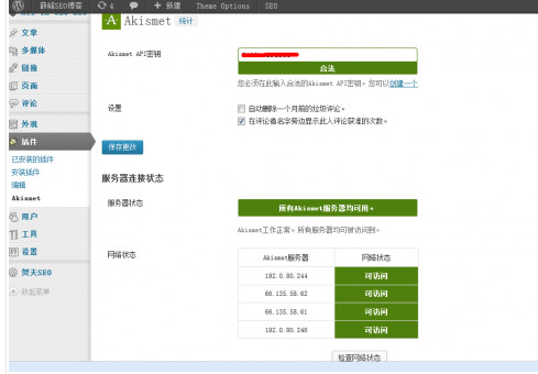 现在返回你的WordPress网站后台,选择插件>Akismet,在文本框中输入刚才记下(复制并粘贴)的WordPress.com API密钥,点击“更新API密钥”按钮。 大功告成,Akismet已经正式启用,之后你就不用担心网站会受垃圾评论骚扰了。