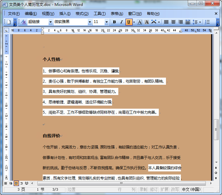 性开朗,充满活力,意志力坚强, 原则性强,有较强的适应能力;对工作认真负责,做事有计划性,有时间和效率观念, 富有团队合作精神,并且善于与人交流,乐于接受新的挑战。勤于总结与反思,不断自我提高。确保工作执行到位。本人具备较强的综合素质,既有文字处理、策划等扎实的专业技能,也具有团队组织、管理能力的实际经验,语言表达和沟通能力强。多年的专业理论学习和工作实践,使我掌握了较好的文字功底,敏锐的观察力,优秀的口头表达能力和关注追踪社会热点的能力。我做事条理性强,乐于与人合作,平时喜爱读书、音乐等。