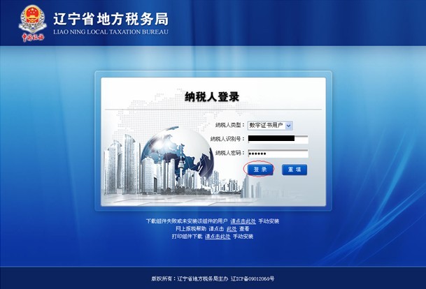 CA证书客户端安装成功后,以后每次进入登录页面就不会再有安装组件的提示,但在申报过程中,需要将LNCA KEY 一直插入到USB中。报税完成后,将USB取出,妥善保存。为使组件能正常运行,请将Internet安全级设为中等,使AxtiveX控件可以运行。 将电子商务安全证书KEY插入到USB接口,在税务登记号框内输入纳税人的税务登记号码,如210302123456789,然后在申报密码框内输入纳税人的六位密码,在证书口令框内输入证书私钥口令,再用鼠标点击下面的“登录”按钮,进行登录。若输入的税务登记号或密码不正确,系统会提示您输入有误,点“返回”按钮可回到登录界面重新登录。