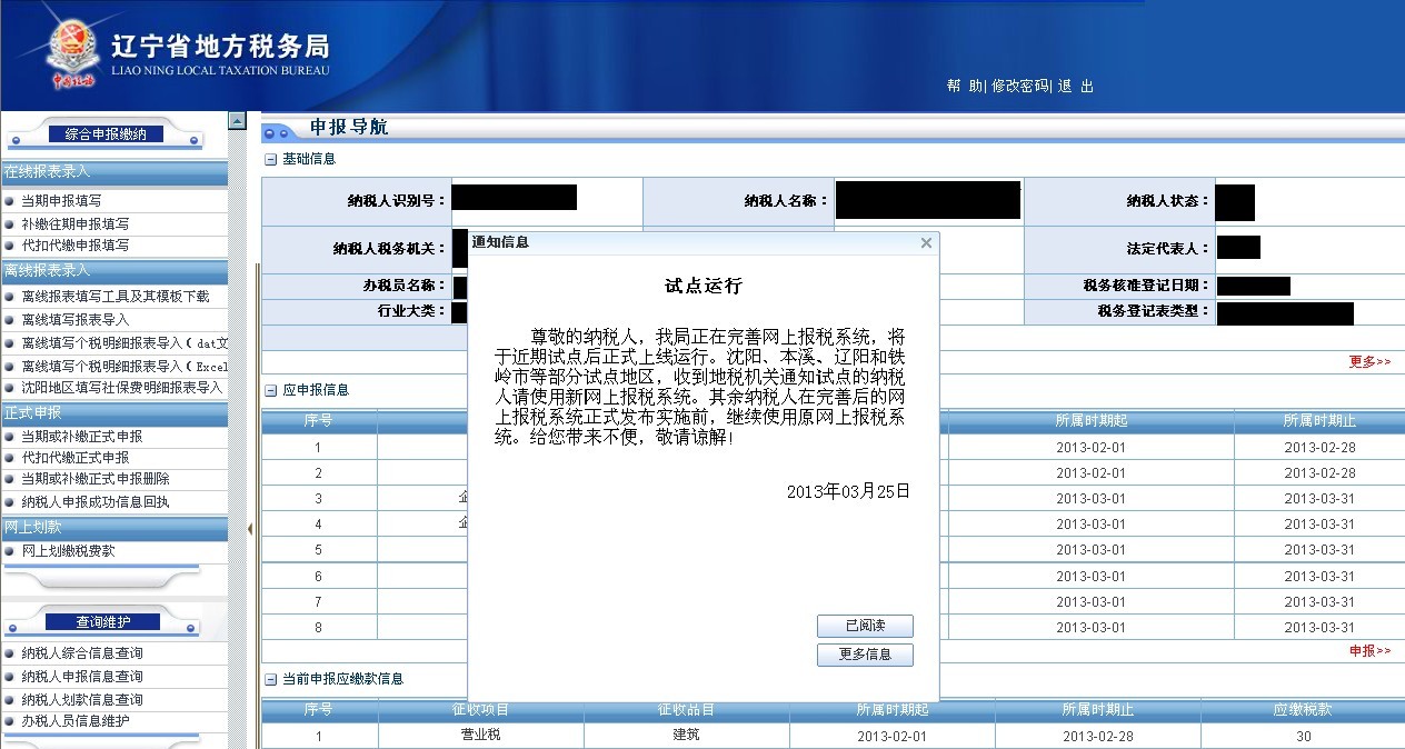 点击“确定”后,在主界面,用户可查看到税务机关发布的通知信息并可通过点击不同的图标按钮进行选择,进入相应功能页面。如下图: