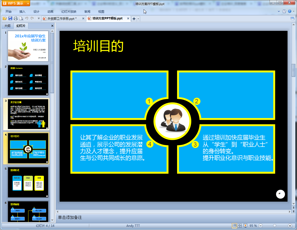 这是给大家带来的一篇培训方案PPT模板,提供给那些需要制作员工培训ppt的朋友们 ,该ppt共有14页内容丰富制作精美,非常合适的一篇培训ppt模板有需要的朋友们可以来这边看看,我们东坡为大家提供免费的下载地址!