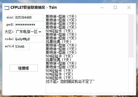 CFPLS7已经过去了,抽奖活动还未结束。这里,小编给大家带来CFPLS7自动抽奖工具,自动兑换抽奖券、自动抽奖,软件很简单、也很实用,需要的朋友可以下载试试哦!