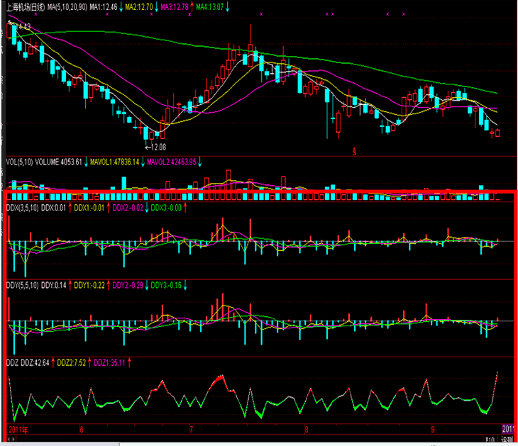 ◆在个股分析页面可以同步列出DDE各项指标进行全面分析,DDX、DDY的红绿柱和DDZ的彩带分析大资金的买入比例和买入强度,红柱越高表明当日大资金买入比例越高,绿柱越高表明当日大资金卖出比例越高。DDZ彩带红色越高,表明大资金买入强度越大,反之亦然。