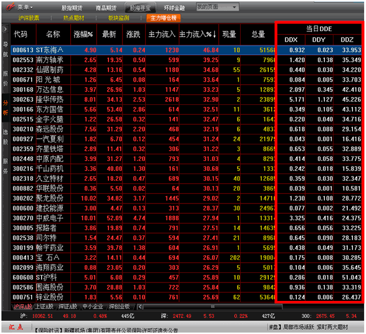 ◆在主力监测页面, 通过对DDX、DDY、DDZ的排序可以选出当日大资金买入比例最高的股票,通过对多日指标的排序还可以分析多日大资金买卖情况。